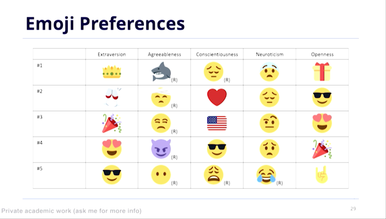 심리 특성에 따라 사용하는 이모지도 조금씩 달랐는데요. 우호성이 낮은 사람은 상어, 악마 이모티콘을 자주 썼다고 합니다. 사람들에게 이모지를 써서 어떻게 더 공감을 사면서 이야기할지 알 수 있겠지요. 이렇게 개인 성향이 결정에 영향을 미치는 것에 관해 많은 연구가 존재합니다. 개인 특성에 따라 다른 넛지를 제공하고 다르게 커뮤니케이션할 수 있습니다.