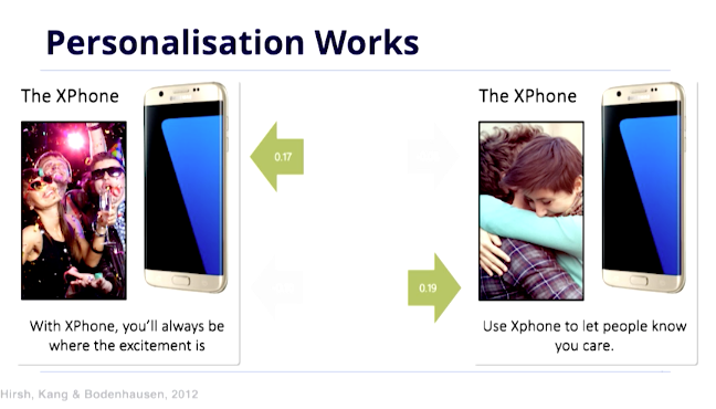 Patrick Fagan은 사이코그래픽을 활용하는 예시를 들어주었는데요. 외향적인 사람을 타겟으로 광고할 때는 사람들이 여러 명 있고 즐거운 분위기의 사진이 더 효과 있고, 내향적인 사람을 대상으로 할 때는 혼자 있는 사람, 뮤트톤 컬러의 사진을 사용하는 게 효과적이라고 합니다. 이런 타게팅 전략이 UX 디자인에도 동일하게 적용될 수 있다는 것입니다.