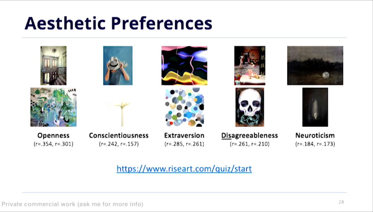 개방성이 높은 사람은 클래식, 재즈 음악을 좋아하고 복잡한 느낌의 미술 작품을 구매할 확률이 높았습니다. 성실성이 높은 사람은 구조화가 잘 되어있고 단순한 그림을 구매할 가능성이, 외향성이 높은 사람은 역동적인 그림을, 우호성이 낮은 사람은 섬뜩하거나 폭력성 있는 그림을, 신경증이 높은 사람은 어두운 그림을 좋아할 가능성이 높았다고 합니다. 이런 특성을 생각해보면, 어떻게 웹사이트의 그래픽을 사람의 심리 특성에 따라 다르게 제공할 수 있을지 생각해 볼 수 있겠습니다.