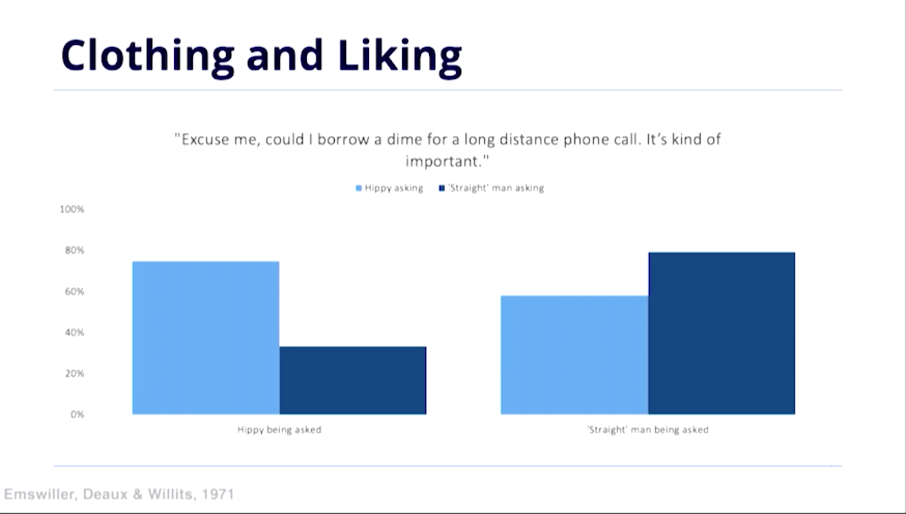 1970년대에 히피 복장을 하거나, 양복을 입고 돈을 빌려달라고 요청하는 실험을 했습니다. 히피 복장을 한 사람이 히피에게 물어봤을 때, 그리고 양복을 입은 사람이 양복 입은 사람에게 물어봤을 때, 각각 그 반대보다 훨씬 높은 확률로 돈을 빌릴 수 있었습니다.