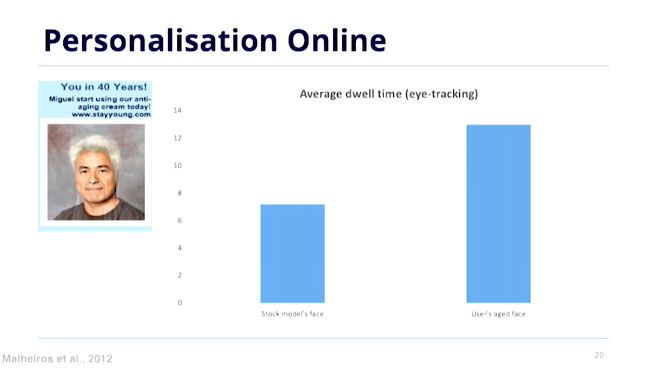 광고에 모델 사진과 본인 사진을 사용하여 게시했을 때, (법적으로 불가능한 일이지만) 아이 트래킹 결과 본인 사진을 모델로 사용한 경우 훨씬 관심을 끌었습니다.