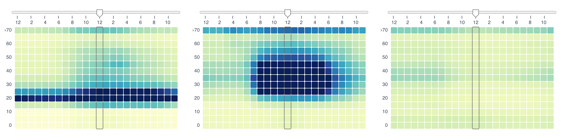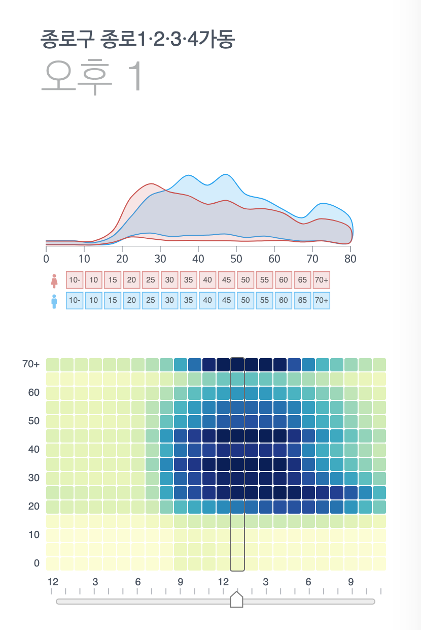 시간에 따른 인구 변화를 보려고 슬라이더를 추가했습니다. 처음부터 시간에 따른 인구수 변화를 지도에서 보고 싶었거든요. 슬라이더를 잡고 이동하면서 바로 변화를 볼 수 있어 재밌는데 저녁에서 새벽으로 볼 수 없어 아쉬웠습니다. 그래서 키보드의 좌우 키를 이용해 저녁 11시 다음에 새벽 12시대로 시간을 이동하게 했습니다. 가급적 직접 이동과 상대적 이동이 모두 가능하면 좋습니다. 자동 애니메이션도 있으면 좋겠지만 방향키를 누르고 있으면 되니 따로 만들지 않았습니다.
