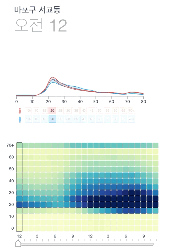 선택된 행정동의 성별 연령대별 인구수 그래프를 추가했습니다. 다른 연령대 구간은 5살 단위로 데이타가 있는데 10살 미만과 70대 이상은 휴대폰 사용자 수가 적어 정확한 통계를 내기 어려워서 한 그룹으로 묶여 있습니다. 그래서 그 구간이 그래프에서 툭 튀어 나오게 됩니다. 인구 통계를 보니 5살 미만과 5-10살 은 거의 비슷하고 정확한 수치를 알고 싶은게 아니기 때문에 반 반씩 두 구간으로 나눠 다른 연령대와 같은 스케일로 자연스럽게 이어지게 했습니다. 70대 이상은 120대 까지 폭이 넓고 행정동별 편차도 크기 때문에 단순히 보정할 수 없어서 처음에는 그대로 두었는데요. 아무래도 다른 연령 구간을 보는데도 신경이 쓰여서 우선은 적당히 자연스러운 높이가 되도록 보정했습니다. 어떻게 표시하면 좋을지 좀 더 고민이 필요합니다.