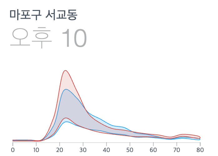 처음에는 현 시각 인구수를 표시하다가 지도에서 처럼 유출입 변화를 보기 쉽도록 기준 인구를 표시했습니다. 지도에서 두 인구 차만을 나타내면 2가지 정보를 잃게 되니 Range Area 차트로 현재 인구, 기준 인구, 변화량 3가지 정보가 모두 보이게 했습니다. 현재 방식의 문제는 차가 음의 영역으로 바뀔때 구분이 되지 않는데요. 날씨 그래프를 그릴 때 처럼 외곽선 두께를 다르게 하거나 하는 방법으로 보완할 수 있을 것 같아요. https://story.pxd.co.kr/683