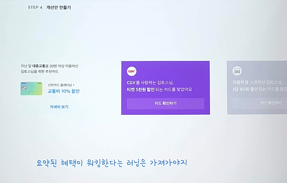 again step 4. 개선안 만들기 카드를 선별하는 과정에서 수백 개의 카드를 모두 잘 보여주는 것은 욕심이라 생각하기 때문에 카드 맞춤 추천 서비스 전면에 10개의 카드만을 노출하였습니다. 카드사별 혜택 좋은 카드들로 채워졌고, 결과적으로 발급량이 13% 증가하였습니다.