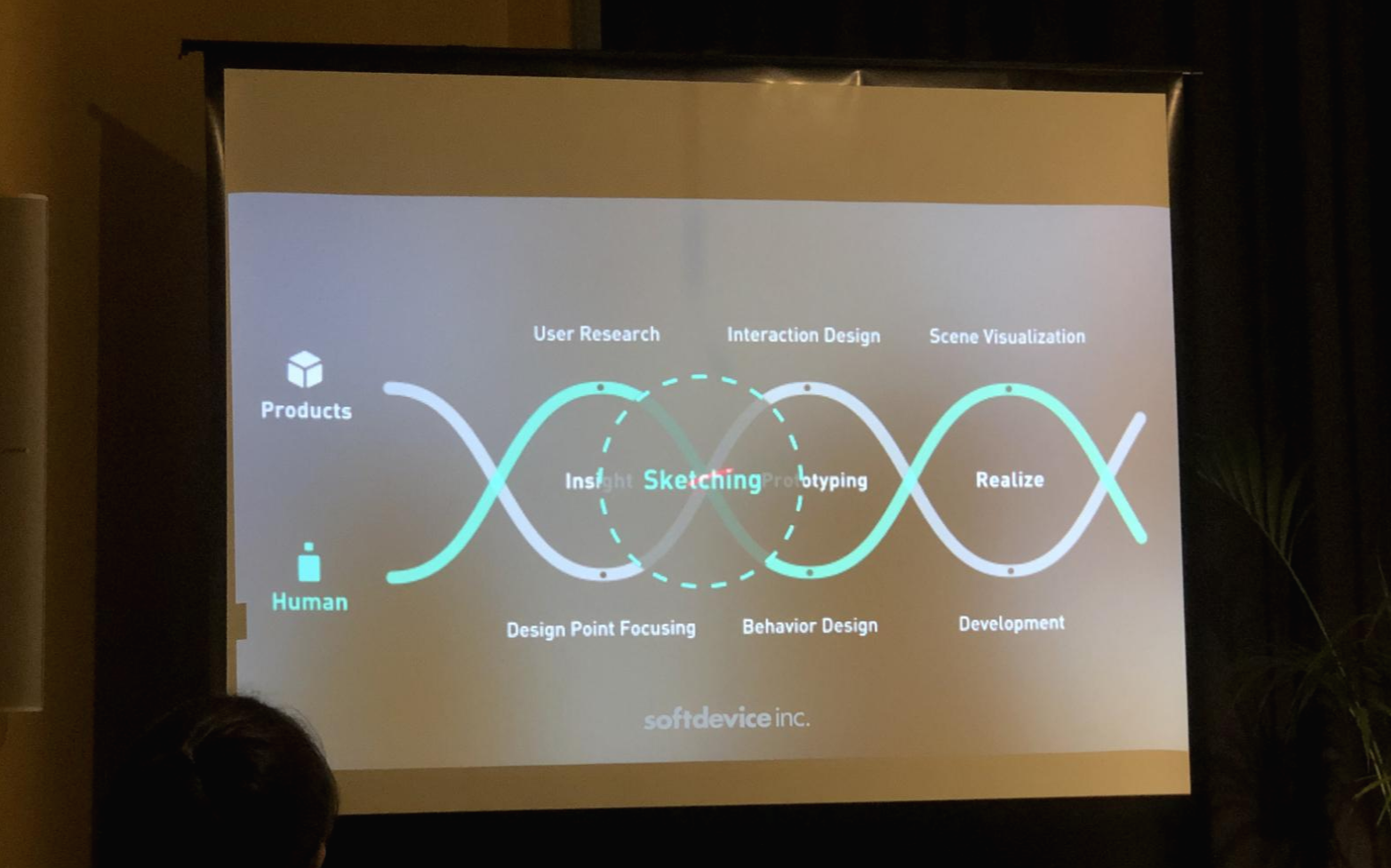 개발 주기입니다. 실제로 개발이 어떻게 이뤄지는지 시각화하여 보여주고 있습니다. Sketching은 시각화 단계로 실제 프로토타입을 개발하기 전 단계입니다. 이 단계에서는 마지막 완성품을 만들기 전에 각각 부품들의 테스트를 진행합니다. 고급 디자인을 위해서는 이 단계에 가장 많은 초점을 둡니다. 초기 단계의 사용자 테스트와 리서치는 Softdevice만 진행하는 게 아니라 고객사가 진행하는 경우도 있고, 실제 제작하는 부분을 함께 진행하기도 합니다.