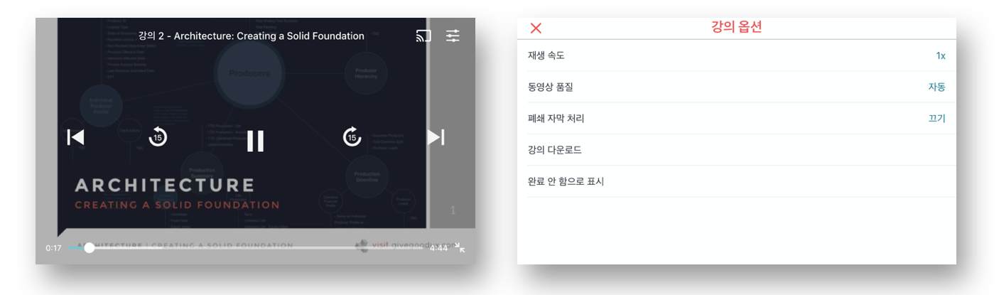 저는 주로 모바일 앱으로 수강했는데 앱 자체도 안정적이고 로딩도 빨랐습니다. 웹과 앱 간의 연동도 잘 되어서, 웹에서 보다 만 영상을 모바일 앱에서 이어 보기 할 수 있었던 점도 좋았습니다. 다만 대부분 강의가 한글로 제공되지 않아서 영어로 수강해야 하고, 영어 자막을 볼 수 있습니다.