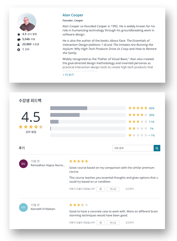 강사 개인 강의평, 강의 자체에 대한 평가를 보고 관련된 강의를 브라우징하고 선택할 수 있는 점도 좋았습니다.