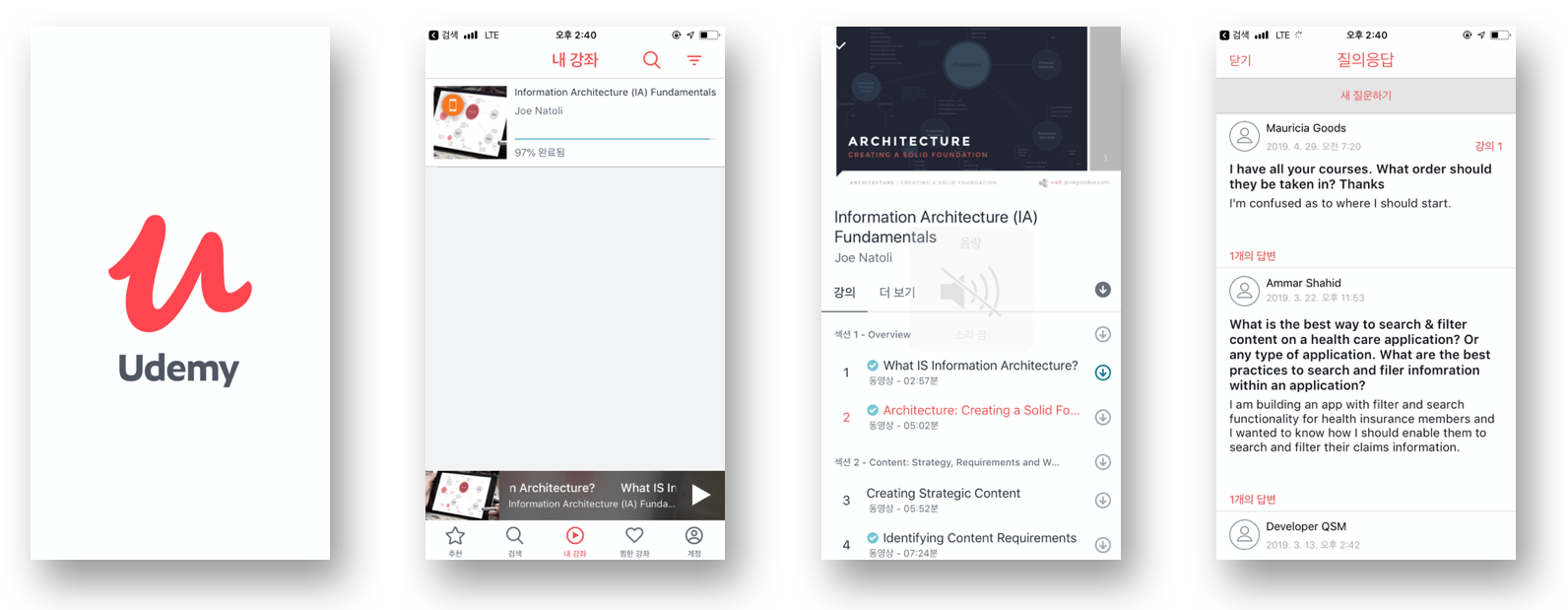 회사 지원으로 Information Architecture 온라인 강의를 수강하였습니다. 취업 준비할 때 Udemy라는 사이트에서 포트폴리오 관련 강의를 수강했던 기억이 떠올라서 Udemy에서 듣게 되었습니다. 저는 입사 후 주로 사용자 조사 및 전략 프로젝트를 해왔고, UI 설계 업무에 익숙하지 않았습니다. 이를 보완하기 위해 활용할 수 있는 자료에는 책, 사내 프로젝트 레퍼런스, 사내 교육 자료 등이 있었습니다.