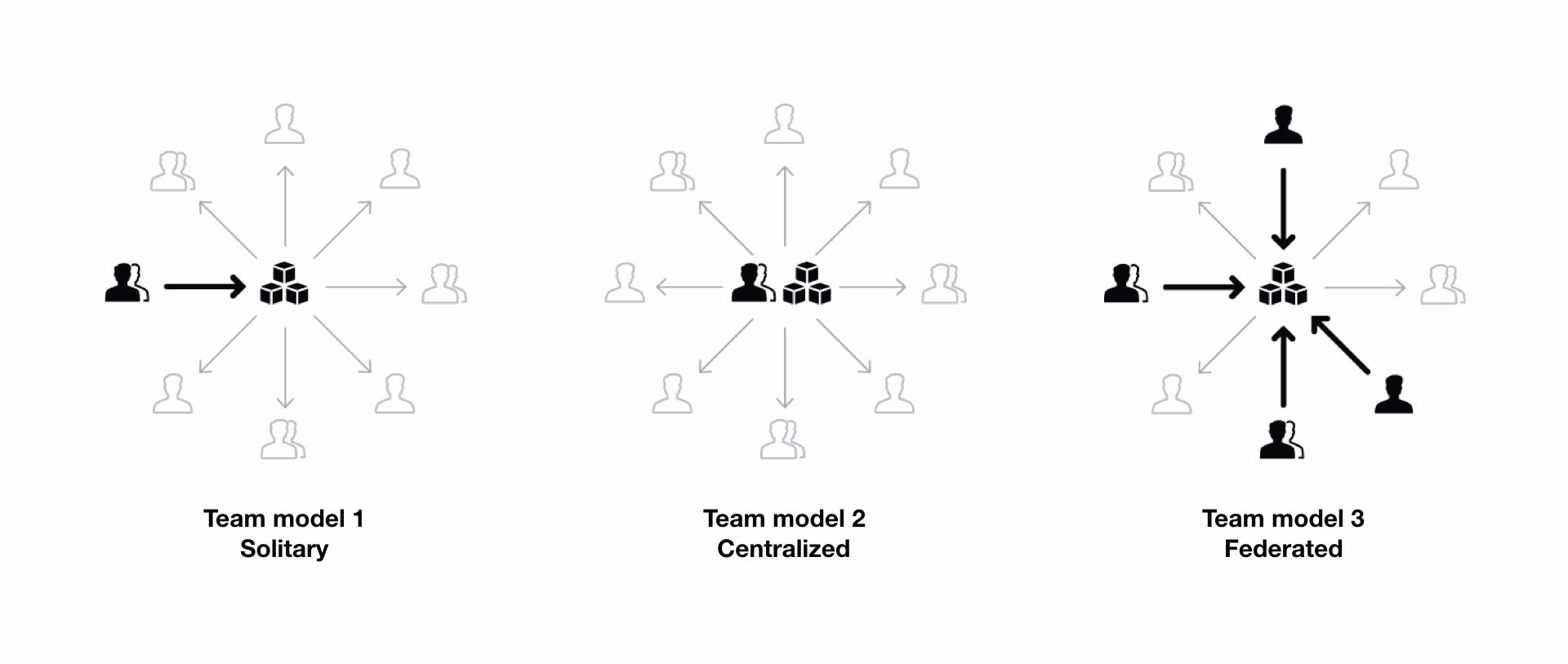 Team Models for Scaling a Design System에서 Nathan Curtis는 디자인 시스템을 운영하는 일반적인 3가지 팀 모델을 제시했습니다.