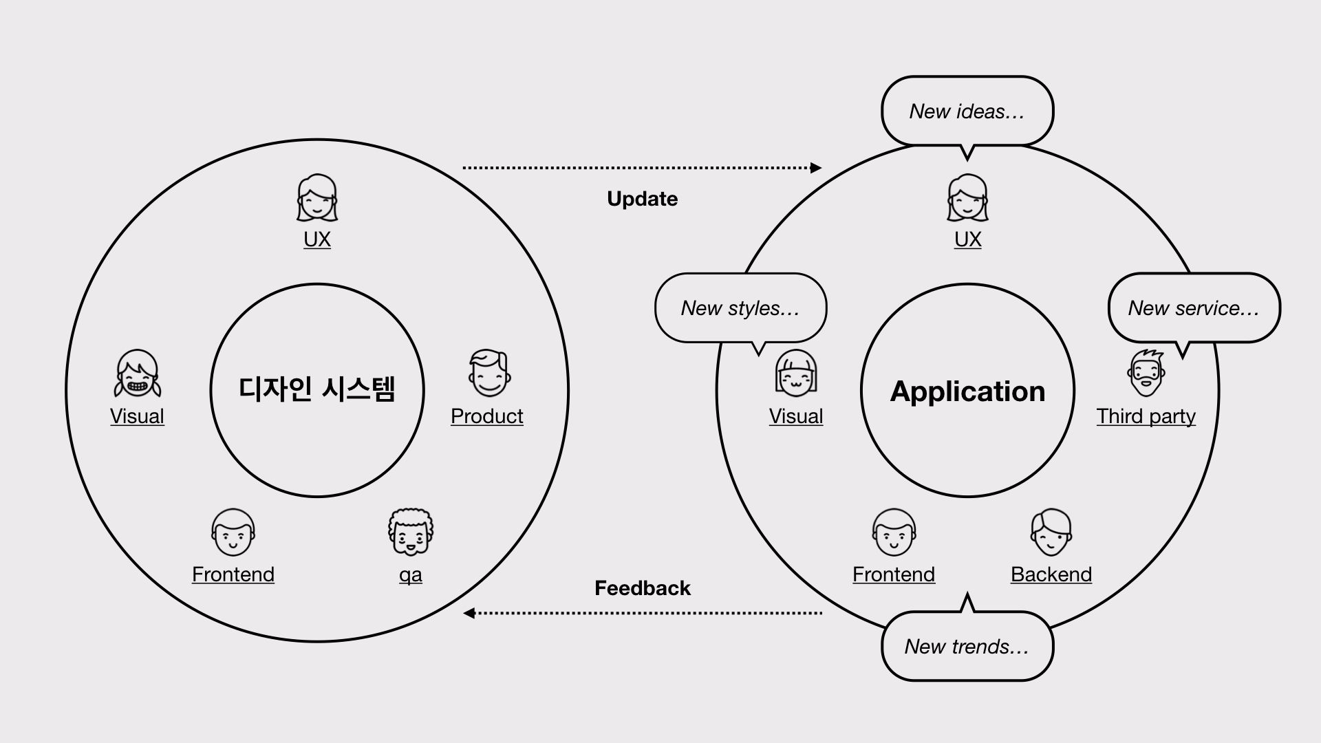 제품의 기능과 용도가 정의된 제품 설명서는 업데이트가 불필요한 반면 디자인 시스템은 디지털 트렌드의 변화, 라이프 스타일의 변화, 국가별 환경 등 다양한 요인으로 사용자의 니즈가 변하기 때문에 내외부 관계자가 유연하게 대응할 수 있도록 운영 모델을 설정하는 것이 더욱 중요한 이유입니다.