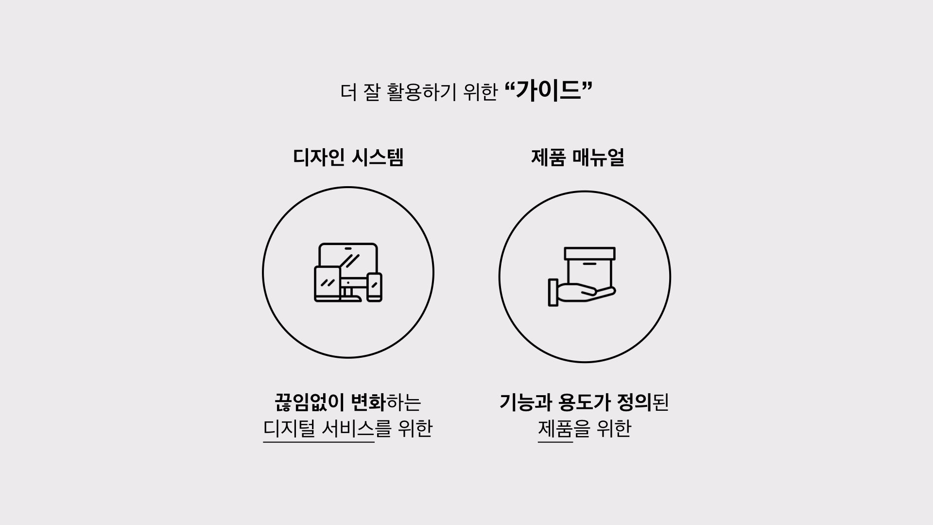 프로젝트를 진행하며 디자인 시스템이 제품 설명서와 유사하다고 느낀 부분은 디지털 서비스를 더 잘 기획하고 개발하기 위한 가이드로서, 제품을 더 잘 활용하기 위한 가이드로서 두 가지의 목적은 비슷하지만 가장 큰 차이점은 설명하고 있는 대상이 끊임없이 진화한다는 것입니다.