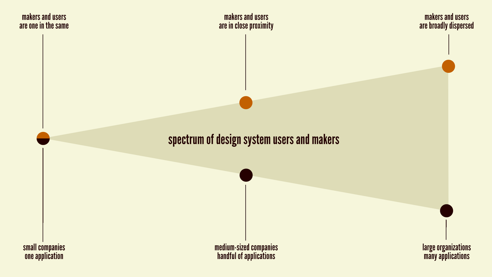 디자인 시스템은 조직의 규모, 서비스의 수에 따라 관리하고 사용하는 인원이 늘어나는 경향이 있습니다. 소규모 스타트업인 경우 현실적으로 전담 운영팀을 꾸리기도 어렵고 디자인 시스템을 활용하는 사람이 시스템을 만드는 경우가 많지만 Salesforce, Airbnb와 같은 대규모 기업인 경우 전담 운영팀을 갖추어 조직적으로 사용자를 관리하기도 합니다.