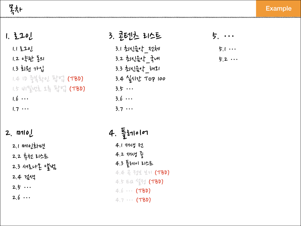 다음은 목차 페이지를 만들자. 목차는 문서에 어떤 내용들이 작성되어 있는지 각 페이지 제목이나 화면 이름을 순서대로 나열한 페이지야. 아직 작성이 덜 된 페이지를 구분하거나, 수정 또는 삭제, 새로 만든 페이지를 목차에 직접 표시할 수도 있어.