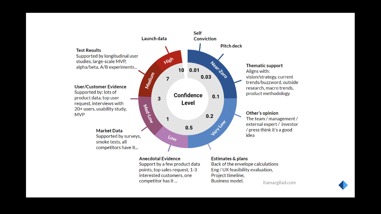 Wojtek은 개선의 효과를 측정하기 위해 UX 방법론을 적극적으로 도입해야 한다고 합니다. 프로덕트의 개선이 잘 되었는지를 측정하기 위해 기존에는 수익, 자원, 사용자 수 등과 같은 운영적 관점의 KPI에 의존했다면, 이제는 프로덕트가 사용자에게 미치는 긍정적인 영향(impact), 사용성 테스트나 실험 등을 통해 사용자에게 검증된 (아이디어에 대한) 확신(confidence)의 정도 등 사용자 중심적 요소들이 기준이 되어야 한다고 얘기하고 있습니다.