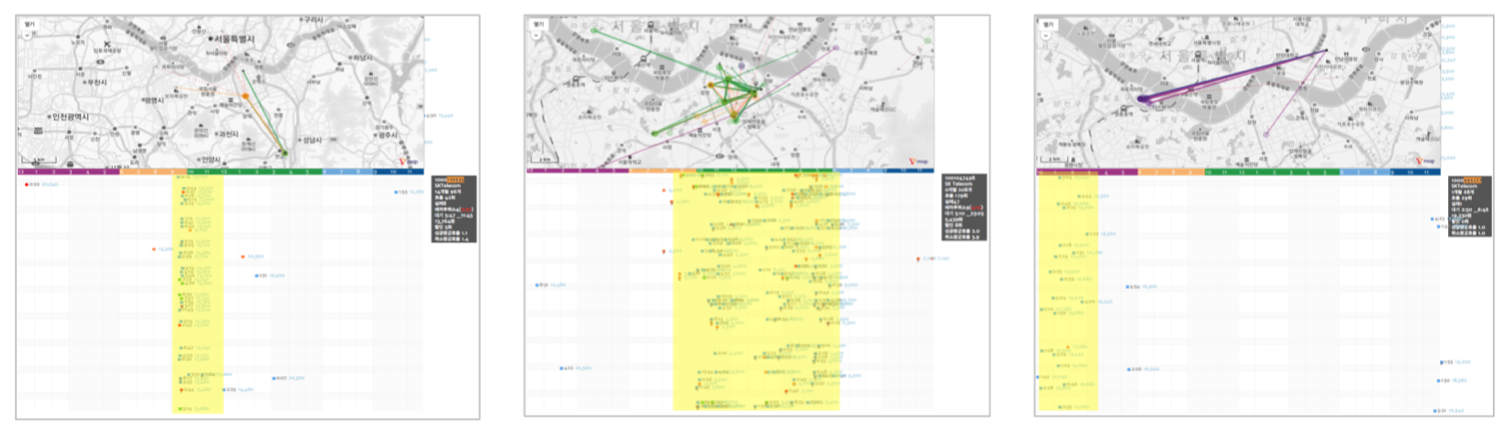 경험으로 알게 된 유용한 시각화 방법은 시간(When) 또는 공간(Where)에 보고자 하는 주요 이용 데이터(What)를 매핑해 보는 것입니다. 무엇을 보고자 하는가에 따라 시각화의 기준은 달라질 수 있지만 시간과 공간이라는 기준은 모두가 영향을 받는 일차적인 조건이어서 기준으로 삼기에 좋습니다. 샘플링된 사용자 데이터를 시간의 축 또는 공간의 축 위에 매핑을 하기 위해서는 코딩을 통하여 간단한 툴을 만들기도 합니다.