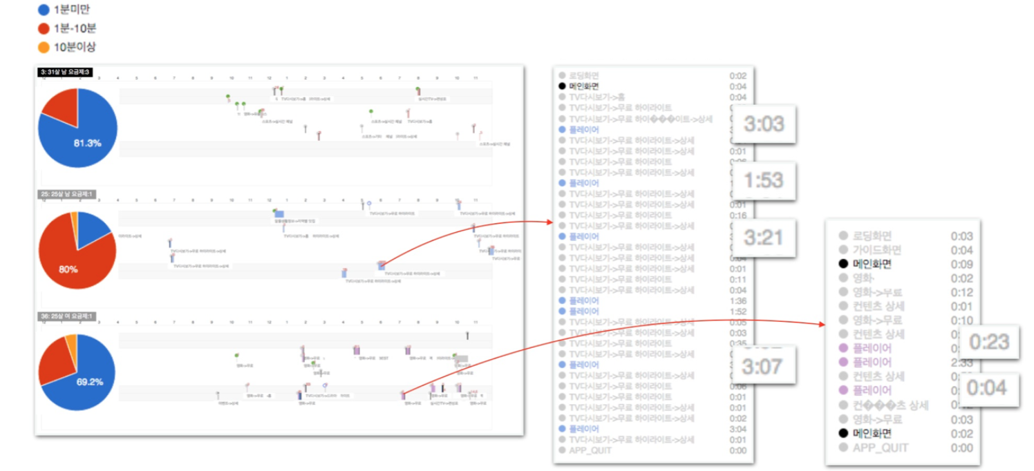 위 예시에서 좌측은 하루 시간대에 따라 VOD 서비스를 이용한 시간을 표시하였습니다. 단순히 이용했다/안 했다의 사실보다는 얼마나 지속적으로 이용했는지, 전체적인 빈도는 어떤지 볼 수 있도록 구성하였습니다. 그리고 한 번 실행할 때 몇 분을 이용하는지 파이 그래프에 컬러와 면적 대비를 주어 한눈에 알 수 있게 하였습니다. 그리고 서비스 이용의 의도와 목적을 이해하기 위하여 우측 이미지와 같이 하나의 이용 세션에서 어떤 항목을 실행했는지 알 수 있도록 구성하였습니다. 물론 이렇게 정리되기까지는 어떤 데이터를 봐야 할지, 어떻게 비교해야 할지에 대한 시행착오가 필요했습니다.
