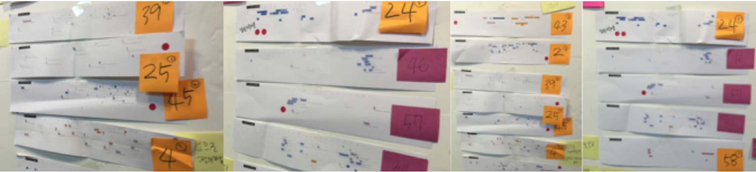 사용자별로 데이터를 시각화하였다면 다음과 같이 종이에 프린트하여 직접 늘어놓고 보는 것이 도움이 됩니다(모니터 화면은 작아요!). 이렇게 하면 팀원들이 다 함께 보면서 토론하고 서로 연관성이 깊은 것들을 떼어 가까운 곳에 붙이고 의미를 찾아 나가는 과정을 자연스럽게 진행할 수 있습니다. 이 과정에서는 사용자들의 행동의 차이를 발견하고 무엇이 이러한 행동의 차이를 만들어 내는지에 대하여 다양한 가설을 세우는 것이 중요합니다. 가끔 생각지도 못했던 요인에 의하여 행동이 달라지는 경우 종종 프로젝트에서의 큰 기회가 되기도 하니까요.