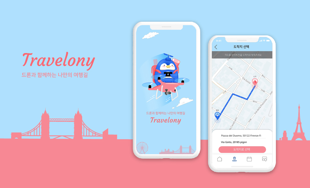 미래를 바꿀 4차 산업혁명의 기술 중 하나인 드론은 모바일 앱을 통해 해외로의 원격조종이 가능해지는 등 빠른 속도로 기술이 개발되어 활용 범위가 넓어지고 있다. 우리는 이러한 발달된 드론 기술을 활용하여 그동안 생소한 여행지의 현지 분위기와 정보를 알지 못해 불안감을 느꼈거나 길 찾기가 어려워서 색다른 여행을 도전하지 못했던 사용자들의 문제를 해결하고자 했다. 실시간 길 탐색으로 정보가 없는 여행지도 안전하게 여행할 수 있도록 도와주는 트래블로니는 다양한 여행 경험의 기회를 제공한다. 사용자는 여행 전 트래블로니로 드론을 원격 조종하여 여행지를 탐색하고 일정을 계획하여 더욱 안전한 여행을 할 수 있다.