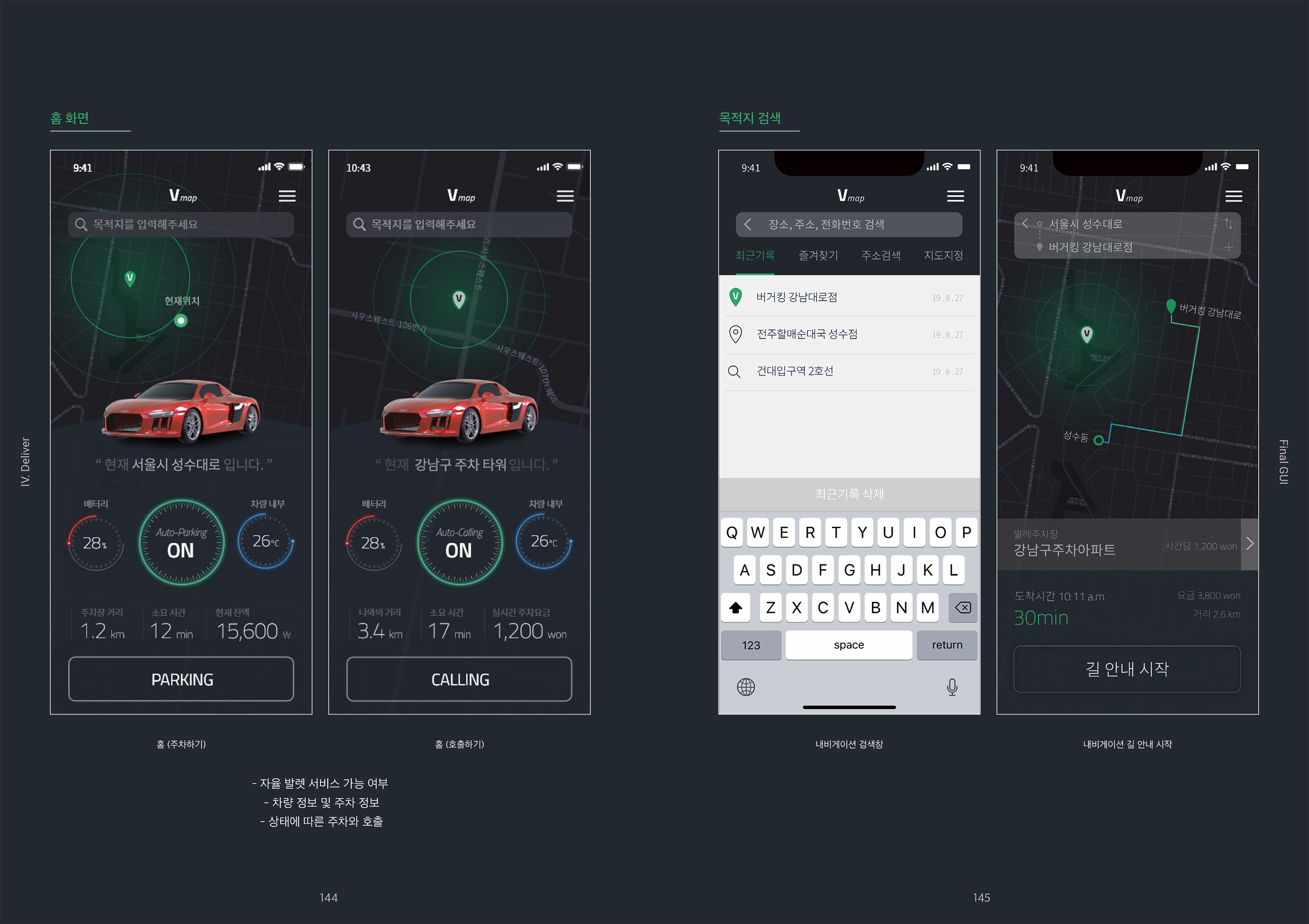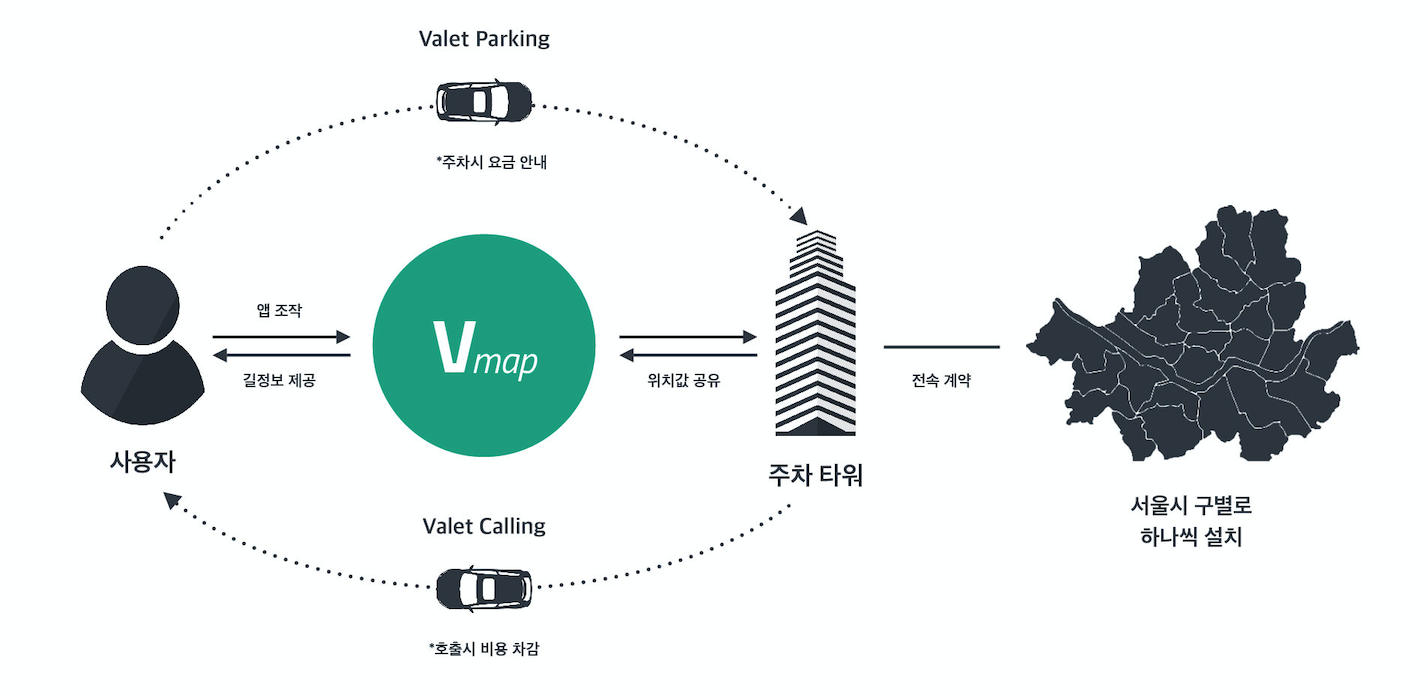 자율주행과 내비게이션의 만남 'Vmap'은 4차 산업혁명의 핵심 기술 중 하나인 자율 주행 기술을 활용해 주차 문제를 해결하고 도심 속 길거리 환경을 개선하고자 고안된 서비스다. 기존의 내비게이션 앱에서 자율 주행 기술을 기반으로 원격 주차와 원격 호출 기능을 도입해 더 편리한 주차 환경을 제공하고자 하였다. 서울시 25개 구별로 주차타워를 설치, 주차타워 주변은 오토 발렛 구간으로 지정되어 사용자는 원하는 때에 주차타워에 차를 원격 주차할 수 있고 차를 다시 호출할 수 있는 구조로 되어 있다.