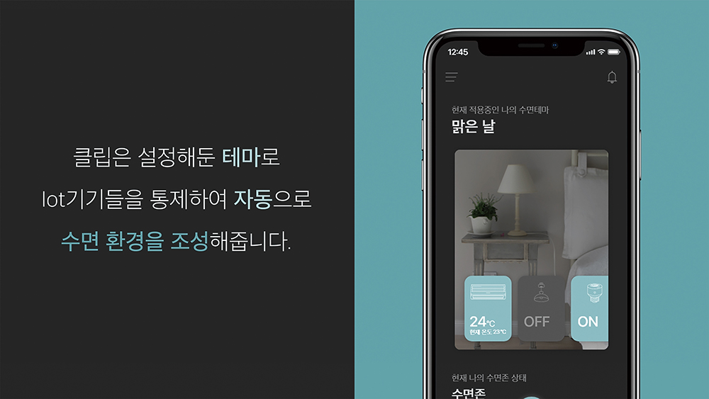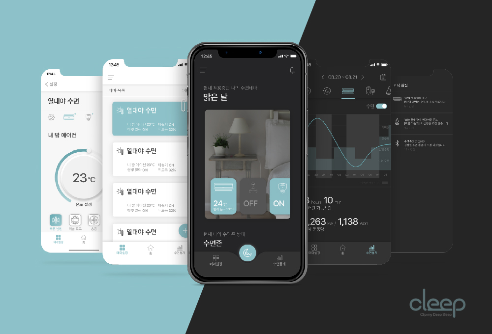 'cleep'은 AI/IoT 기술을 활용하여 자동으로 수면 환경을 조성해주고, 수면의 질 향상을 돕는 수면 돌보미 서비스이다. 설정해 둔 수면 테마를 자동으로 실행해주는 '수면 환경 자동 조성 기능', 통계를 바탕으로 한 '맞춤 수면 팁', 기상 시 자동으로 추가 알람을 중지해주는 '수면존 기반 알람 제어 기능'으로 사용자의 귀찮음을 덜고 쾌적한 수면을 제공한다. 주로 밤에 사용하는 서비스임을 고려하여 앱 디자인은 night 모드와 day 모드 두 가지로 제작되었으며, 각 모드는 시간대에 맞게 적용된다.
