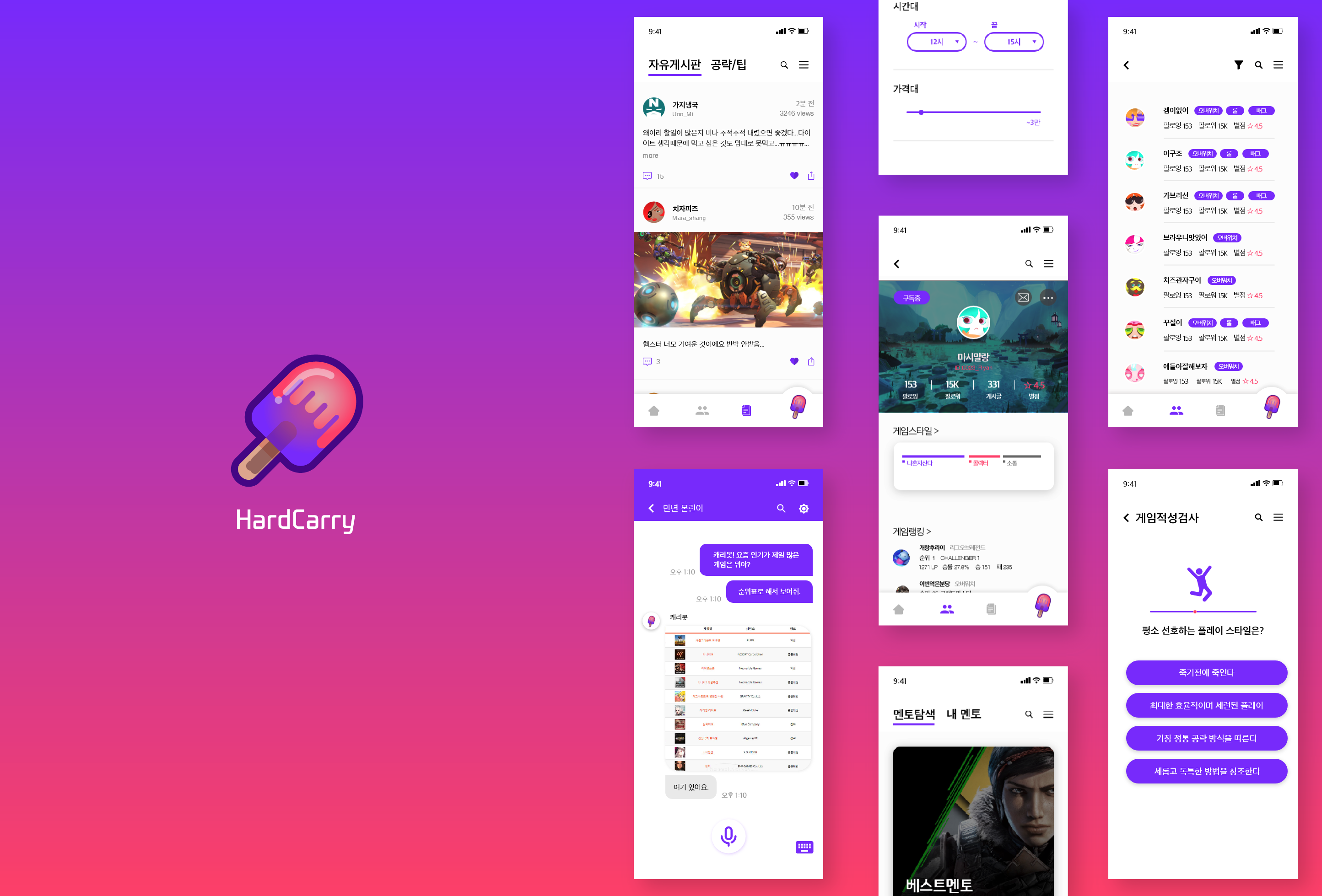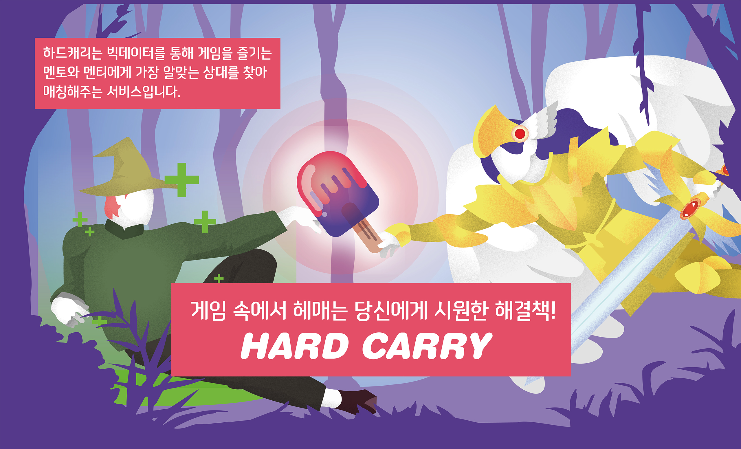 게임 산업이 세계적으로 대중화되면서 전 세대를 걸쳐 게임에 대한 인식이 달라지고 관심이 커지게 되고 다양한 사람들이 게임에 유입되었다. 하지만 이들은 평소 게임을 플레이해본 경험이 적어 이미 있던 게이머들과의 실력 차이나 게임에 난이도 등 진입장벽에 막혀 좌절하고 포기하게 되었다. '하드캐리'는 이처럼 게임을 플레이하는 데 어려움을 느낀 사람들을 위한 게임 멘토&멘티 매칭 서비스이다. 빅데이터를 통해서 사용자에 게임 플레이 데이터를 분석하고 적성검사를 통해 사용자에 성향을 분석함으로써 멘티에게 가장 알맞은 최적에 멘토를 추천해준다. 또한, 챗봇을 통해서 게임에 대한 정보를 즉각적으로 제공함으로써 사용자에 편의성을 높이고자 했다.
