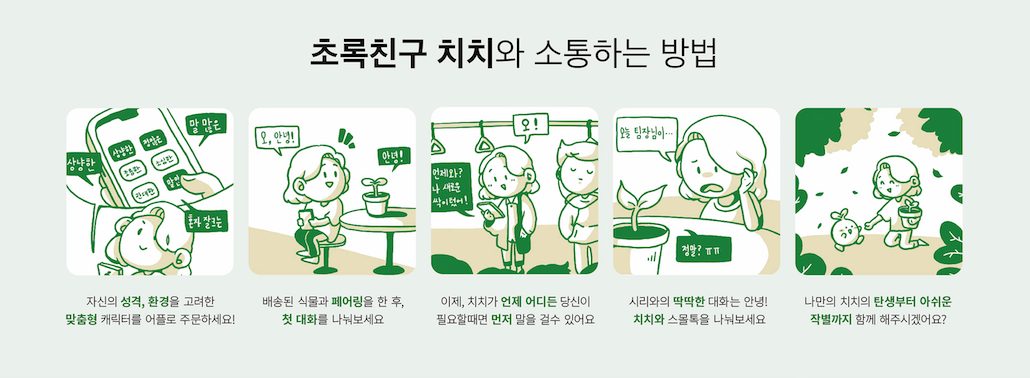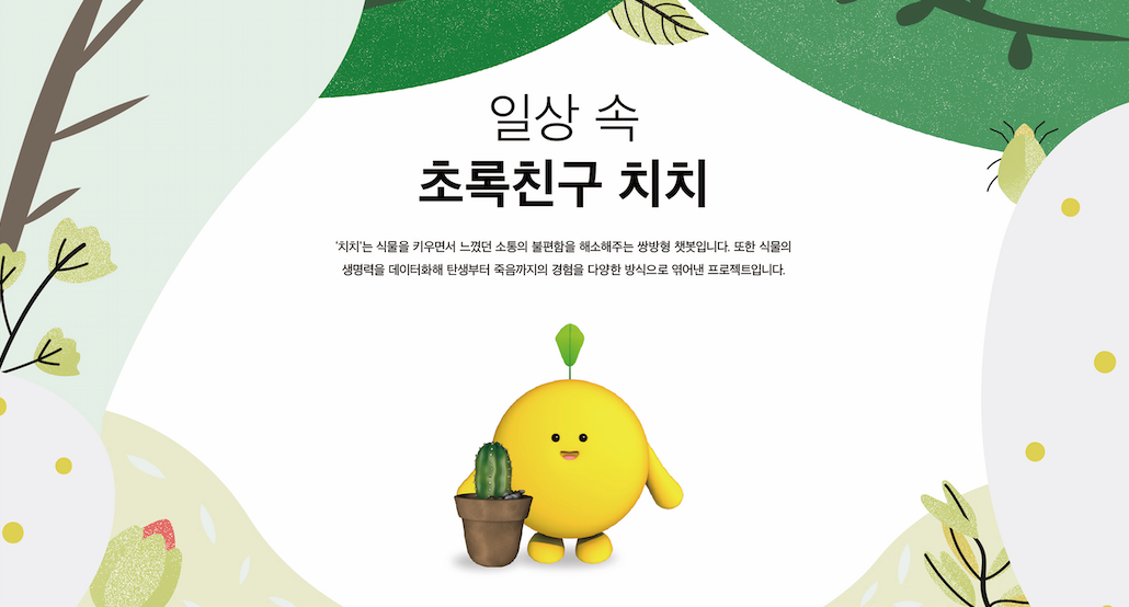 스마트 화분과 AI 서비스를 결합한 '치치'는 쌍방향 식물관리 앱이다. 시리나 빅스비와 같이 이미 서비스의 인격체가 형성된 채 사용자를 만나는 AI와는 달리, '치치'는 맞춤형 성격설정으로 사용자를 맞이한다. 식물을 키우면서 느꼈던 소통의 부재나 관리의 어려움 또한 '치치'와의 쌍방향 소통을 통해 해소할 수 있다. 스마트화분과 IoT 기술의 결합으로 실시간 조도, 습도, 온도를 확인하고 조절할 수 있으며 이를 실시간 챗봇으로 전달받을 수 있다. 이 모든 경험을 우리의 대표 캐릭터 '치치'와 함께 제공하고자 한다.