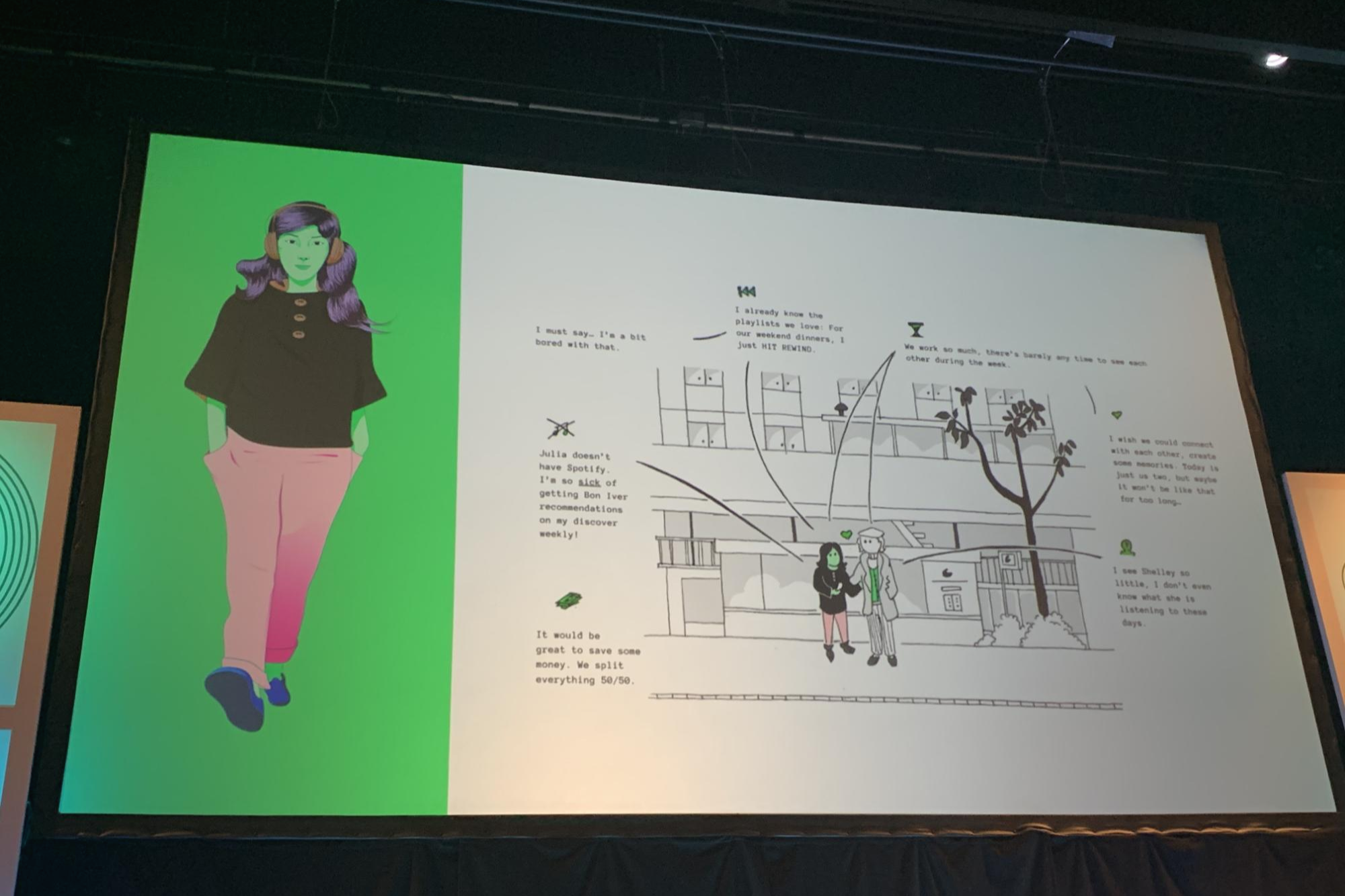 첫 번째 사례인 '프리미엄 듀오'는 두 사람의 계정을 연결하여 플레이리스트를 함께 쓰고 요금도 함께 낼 수 있게 하는 멤버십 프로그램입니다. 이 프로젝트의 브리프를 받은 후, 그의 팀은 이 프로젝트를 리드하는 팀으로써 이 프로젝트가 어떤 사용자 경험을 가져야 하는지 다른 팀들이 참고할 수 있는 수준으로 빠르게 가시화하고 싶었다고 합니다. 그래서 프리미엄 듀오가 어떤 잠재력을 가지고 있는지 보여주는 스토리보드를 그리는 일에 가장 먼저 착수했습니다. 스포티파이의 기존 퍼소나에 새 서비스에 대한 맥락을 추가하는 방식으로 작업을 시작했다고 하는데요. 기존 퍼소나는 회사의 모든 구성원에게 친숙하기 때문에 퍼소나에 대해 별도로 설명할 필요가 없었다고 합니다.