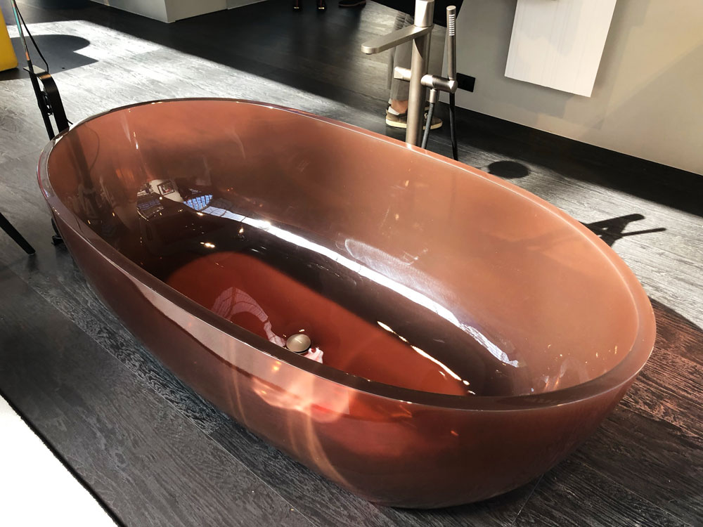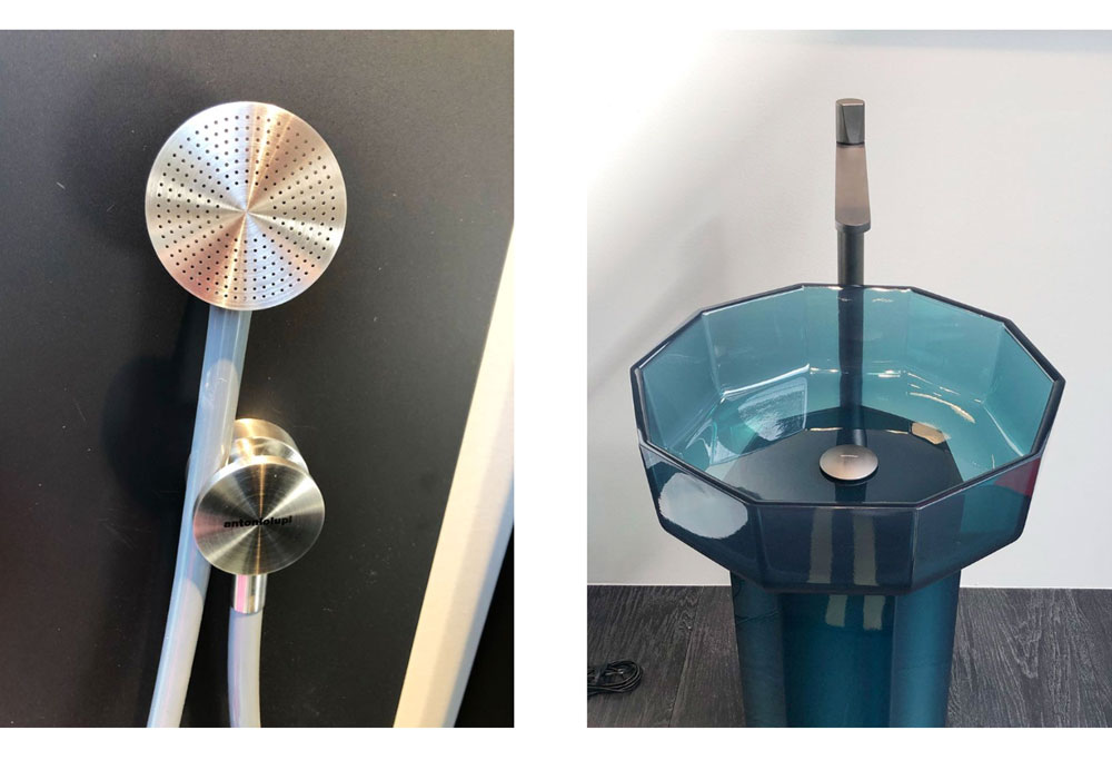 antoniolupi 브랜드의 청진기 모양 샤워기와 반투명으로 컬러링 된 세면대와 욕조