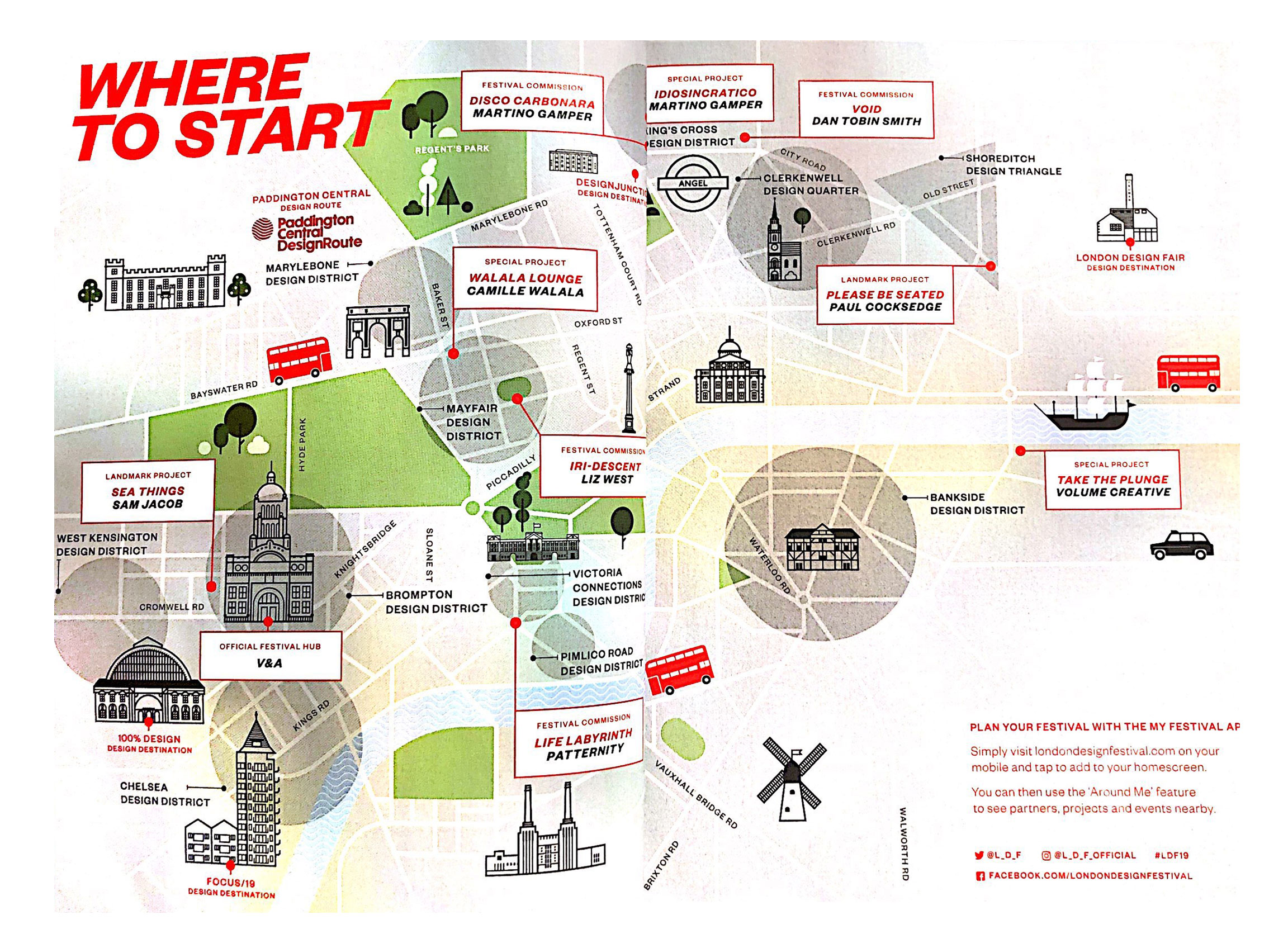 2019년의 런던 디자인 페스티벌(London Design Festival)은 9월 14일부터 9월 22일까지 진행되었으며, 아래와 같이 여러 곳의 행사를 한눈에 볼 수 있는 가이드 북을 통해 관심 가는 행사를 확인할 수 있었습니다. 이 중에서 인상 깊게 봤던 행사 2개를 소개하겠습니다.
