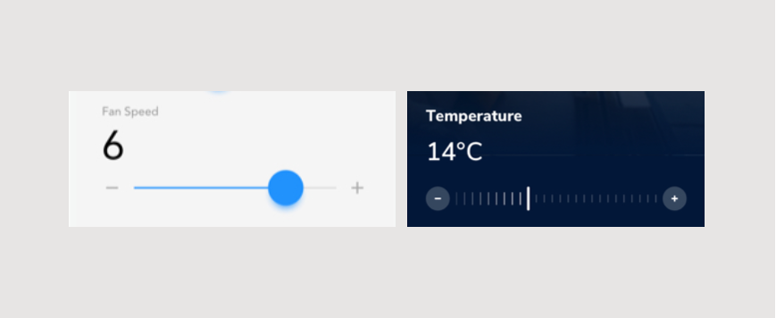 좌측 슬라이더의 경우 영역에 따라 온도를 조정하는 터치 버튼의 크기를 강조하여 해당 기능을 중요하게 표현하고 있고, 우측의 예시는 마이너스 플러스 버튼의 표현을 더 강조해 해당 기능을 주요하게 나타내고 있습니다. 이와 같이 동일하거나 유사한 컴포넌트 내에서도 어떤 기능을 우선순위로 나타낼 것이냐에 따라 강조하는 부분이 달라질 수 있습니다.