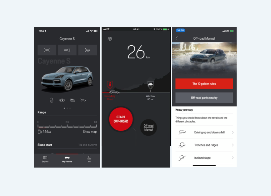 Porsche의 커넥티드 앱 서비스는 주요 버튼의 컬러를 Red 컬러로 사용하여 제일 중요한 위계의 컴포넌트에만 강조하여 사용하고 있습니다. 디자인의 규칙을 통해 강조할 부분에만 적용하면 시각적 위계가 명확하게 드러납니다.