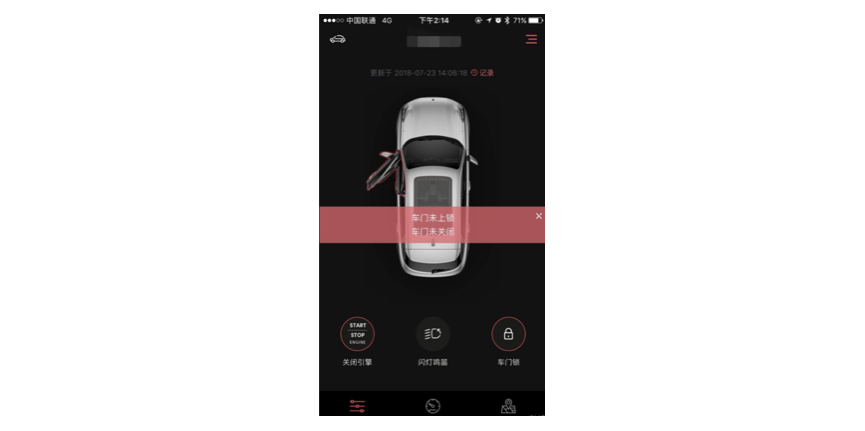링크 앤코의 커넥티드 카 앱에서는 차량의 문이 열린 상황을 알려주는 스낵바를 강하게 대비시켜 표현합니다. 화면 중앙에 위치하는 실사에 가까운 이미지 위에 강렬한 빨간색의 스낵바가 덮는 대비 표현을 통해 사용자에게 긴급 상황을 효과적으로 알려줍니다.