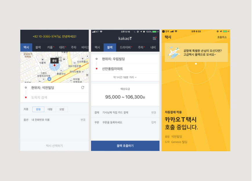 카카오 택시는 버튼과 탭 등 주요 컴포넌트에 브랜드 컬러인 Yellow와 대비되는 Blue를 사용해 주요 기능을 강조하여 표현합니다. 브랜드를 나타내는 콘텐츠 컬러와 기능을 수행하는 컬러를 분리하여 사용자가 주로 행해야 하는 액션을 컬러를 통해 강조하고 화면 내의 위계를 명확히 표현하고 있습니다.