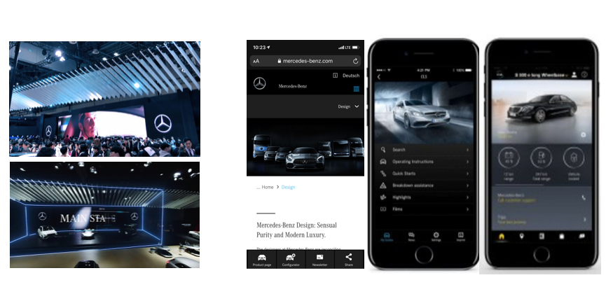 벤츠는 Global Common Booth Design 'Silver Flow'라는 콘셉트로 벤츠만의 빛에 대한 표현과 다크 한 테마의 부스 디자인, 심벌의 은색 금속을 연결시킨 조형물로 벤츠의 아이덴티티를 표현하고 있습니다. 디지털 서비스에서도 다크 테마와 함께 강렬한 빛을 표현하는 이미지, 버튼에 표현된 은색 금속 질감 표현을 통해 고유의 브랜드 아이덴티티를 반영합니다.
