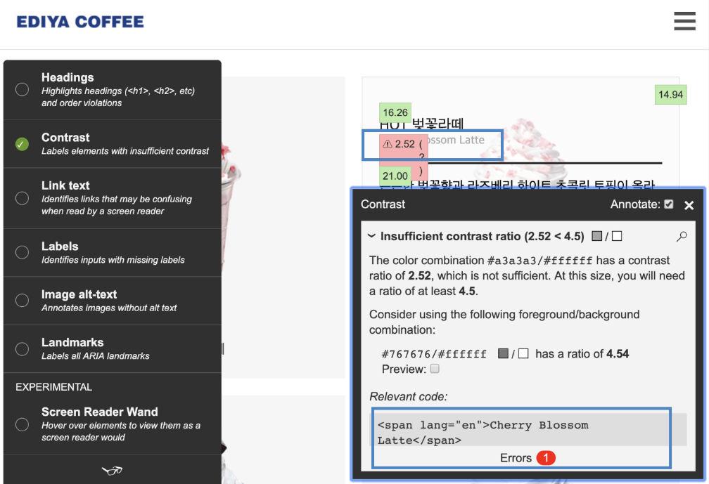 색상으로 정보를 제공할 경우 전경 색상과 배경 색상의 명도 대비가 최소한 4.5 이상이어야 합니다.