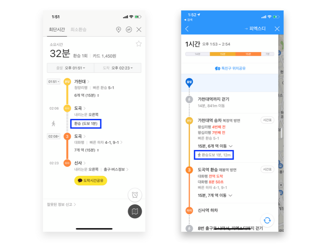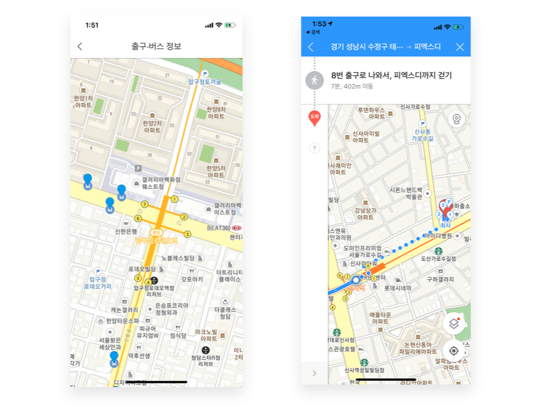PS - 최근 카카오맵에서는 내 위치를 친구와 실시간으로 같이 공유할 수 있는 기능을 추가했다. 톡친구 위치공유 기능이라고 한다. 꽤나 매력적인 기능이라고 생각하며, 이런 시도들이 계속되었으면 좋겠다. 때로는 기본적인 기능 외에도 이런 사용 패턴을 고려한 기능들이 추가될 때 비로소 매력적인 서비스가 될 수 있겠다.