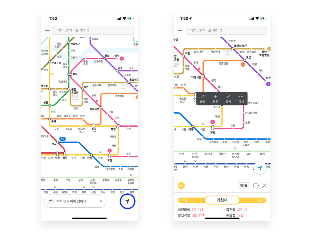 1. 카카오지하철 앱의 장점은 출발역과 도착역을 지정하기가 편하게 되어있다. 우측 하단의 화살표 표시를 누르면 내 현재 위치정보를 파악하여 가장 가까운 역을 지정해준다. 이 기능을 발견하고 나서 상당히 만족하고 있다. 처음에는 이 플로팅 버튼이 이런 기능을 제공하는지 잘 몰랐다. 다만 아쉬운 점은 이 플로팅 버튼이 '현재 역 선택하기'와 같은 느낌을 표현할 수 있는 아이콘으로 변경되면 좋을 것 같다.