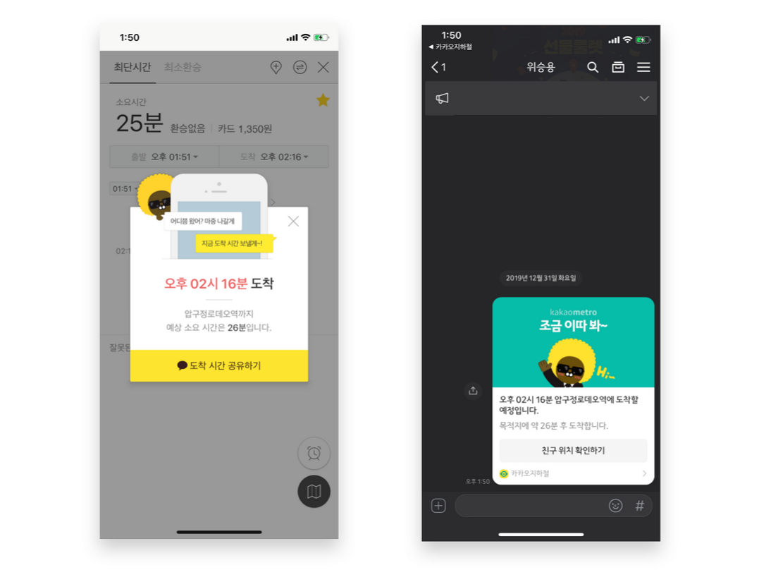 3. 이후 도착 예정 시간을 약속에서 만날 사람들에게 카카오톡 메시지로 전송한다. 나와 약속이 있는 사람들은 내가 해당 위치에 대략 몇 시까지 도착할지 예측할 수 있다. 꽤나 재미있는 기능이고 잘 사용하고 있다.