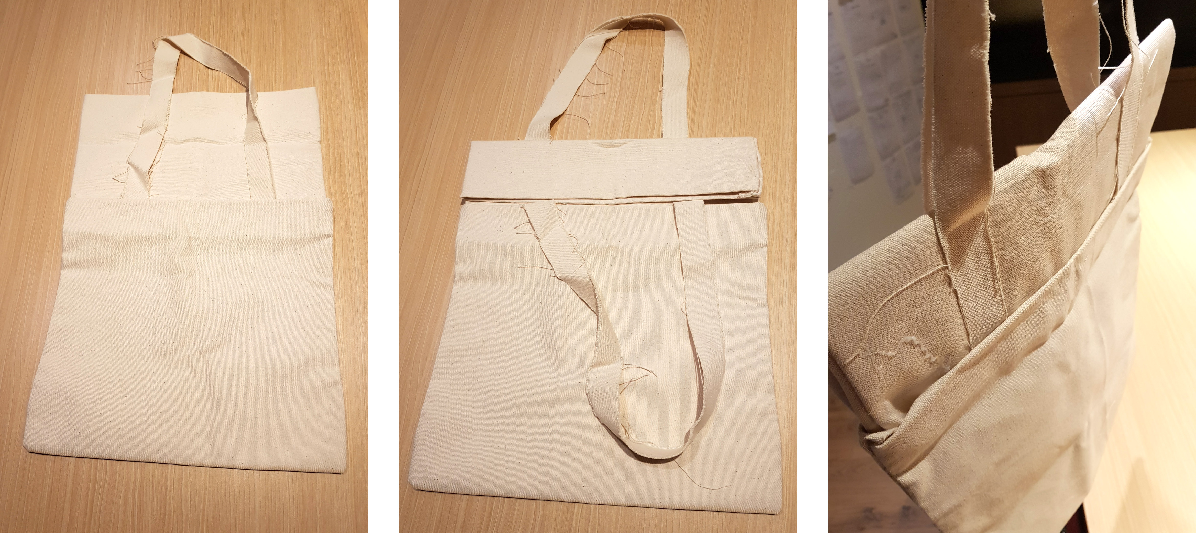 에코백 입구 부분을 지퍼, 벨크로, 스냅 버튼 같은 것들로 임시 봉인한다면 가방 안이 덜 보이거나 물건을 쏟을 염려는 줄어들겠지만, 그런 재료들은 썩지 않기 때문에 그것들로 봉인을 한다면 진정한 에코백이라 할 수 없다 생각했다. 그래서 다른 봉인 방식을 찾다가 에코백 입구 자체를 한 번 접는 ‘폴드 오버 가방’ 방식이 좋겠다고 생각했고, 여러 폴드 오버 가방 중 몰스킨 토트백의 폴딩 방식이 이번 에코백 제작에 가장 적합하다고 판단했다.