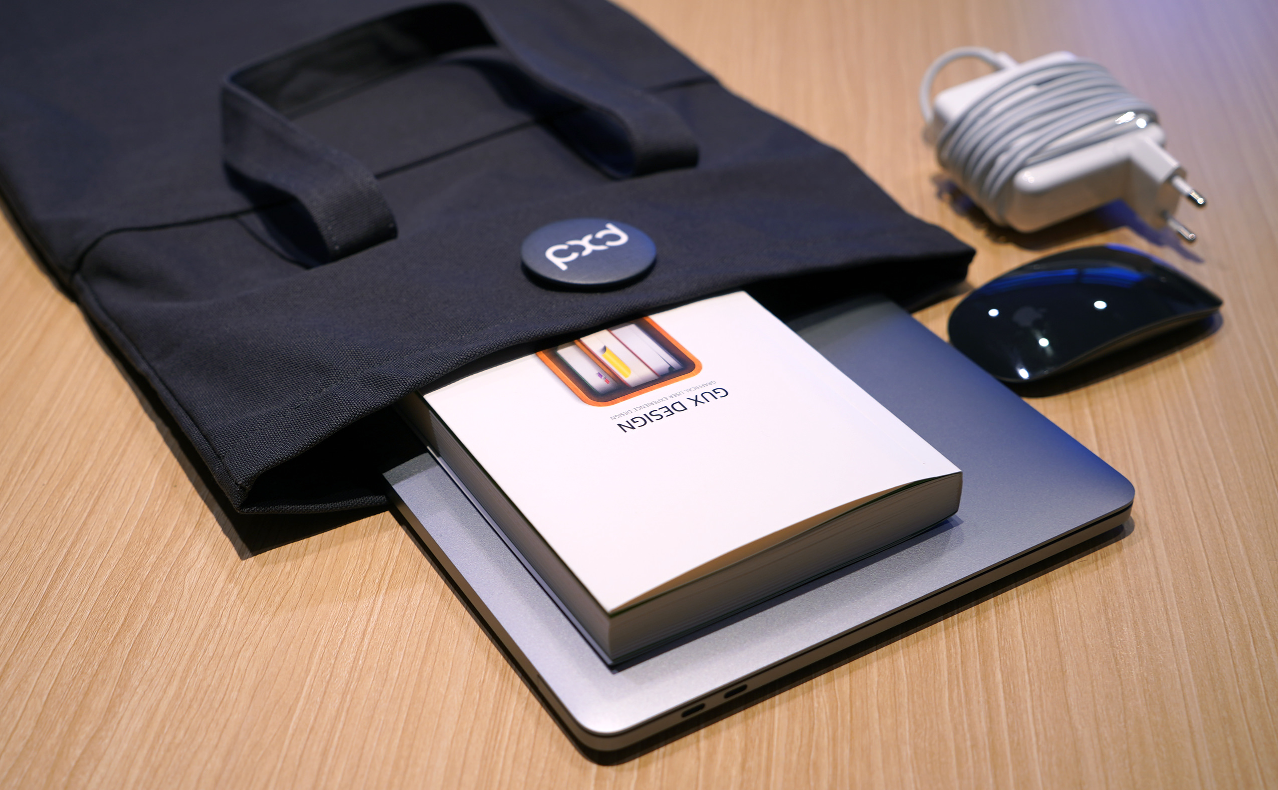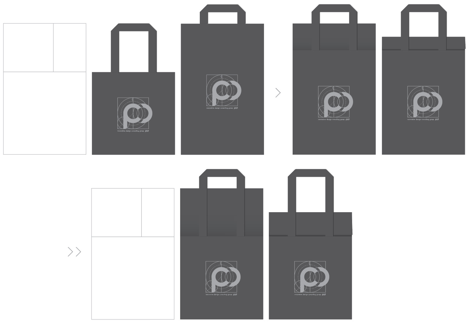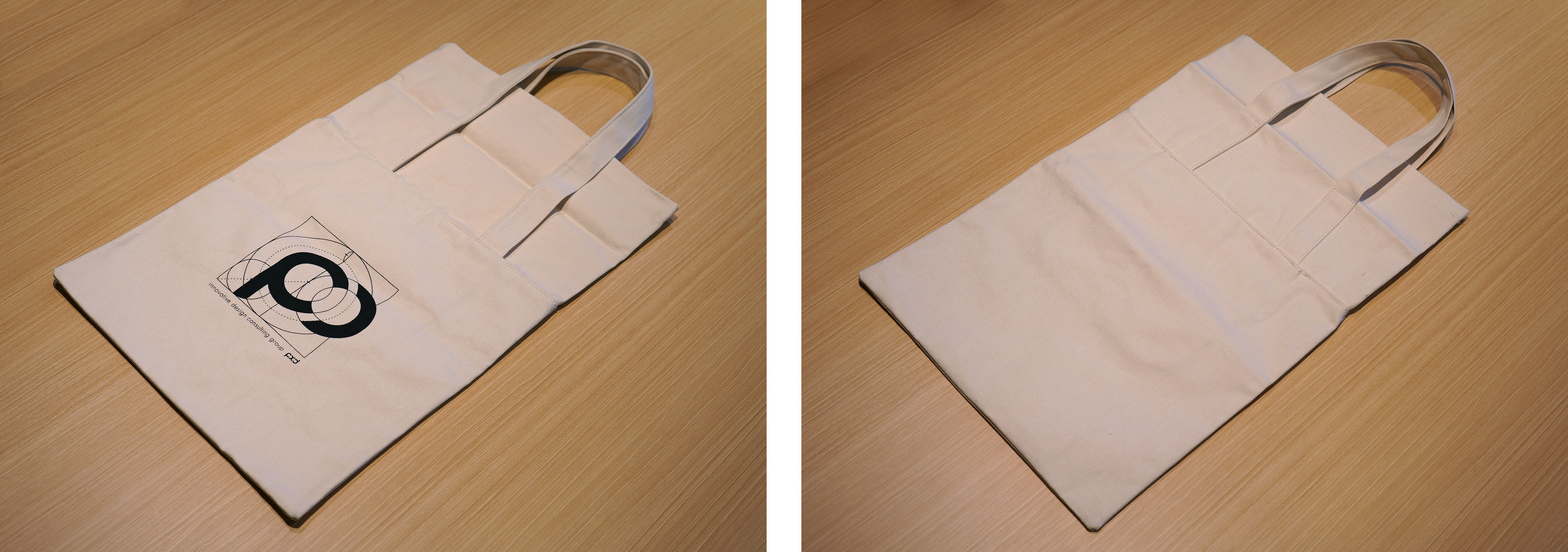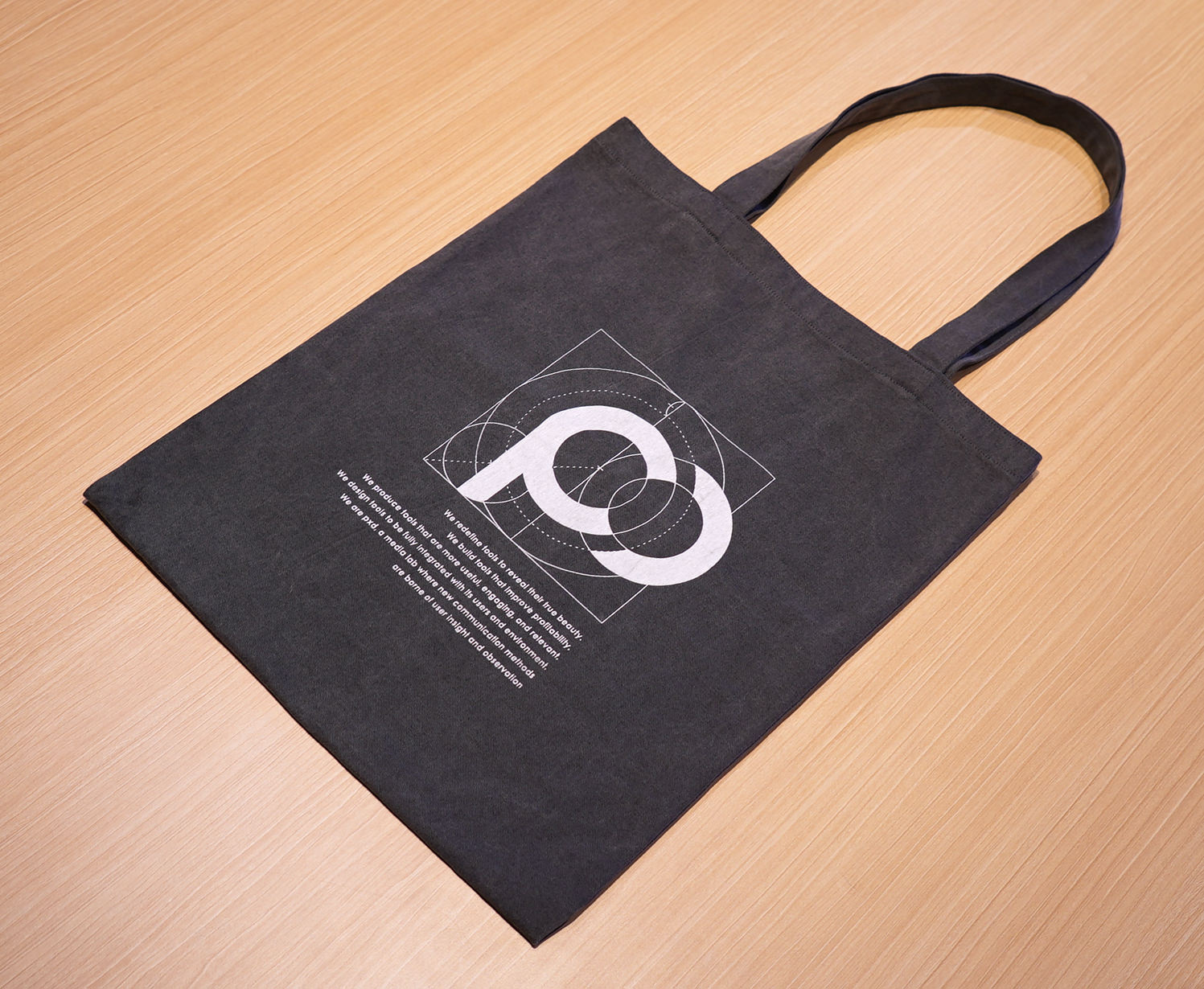 문제는 인쇄할 내용이었는데, 회사 로고를 넣어 인쇄하자니 조금 망설여졌다. 기업 로고가 인쇄된 에코백들을 필자도 선호하지 않는 데다, 아무리 자기가 다니는 회사의 로고라 하더라도 일종의 패션 아이템인 가방에 기업 로고가 인쇄되어 있다면 회사 사람들이 들고 다닐까 싶었다. 그렇다고 사내 행사 기념품인데 회사의 이미지를 배제할 순 없어서 아래와 같이 ‘황금비율을 적용한 pxd 로고타입 작도법’을 넣어 추상화(?)하는 방식으로 그런 걱정들을 덜었다.