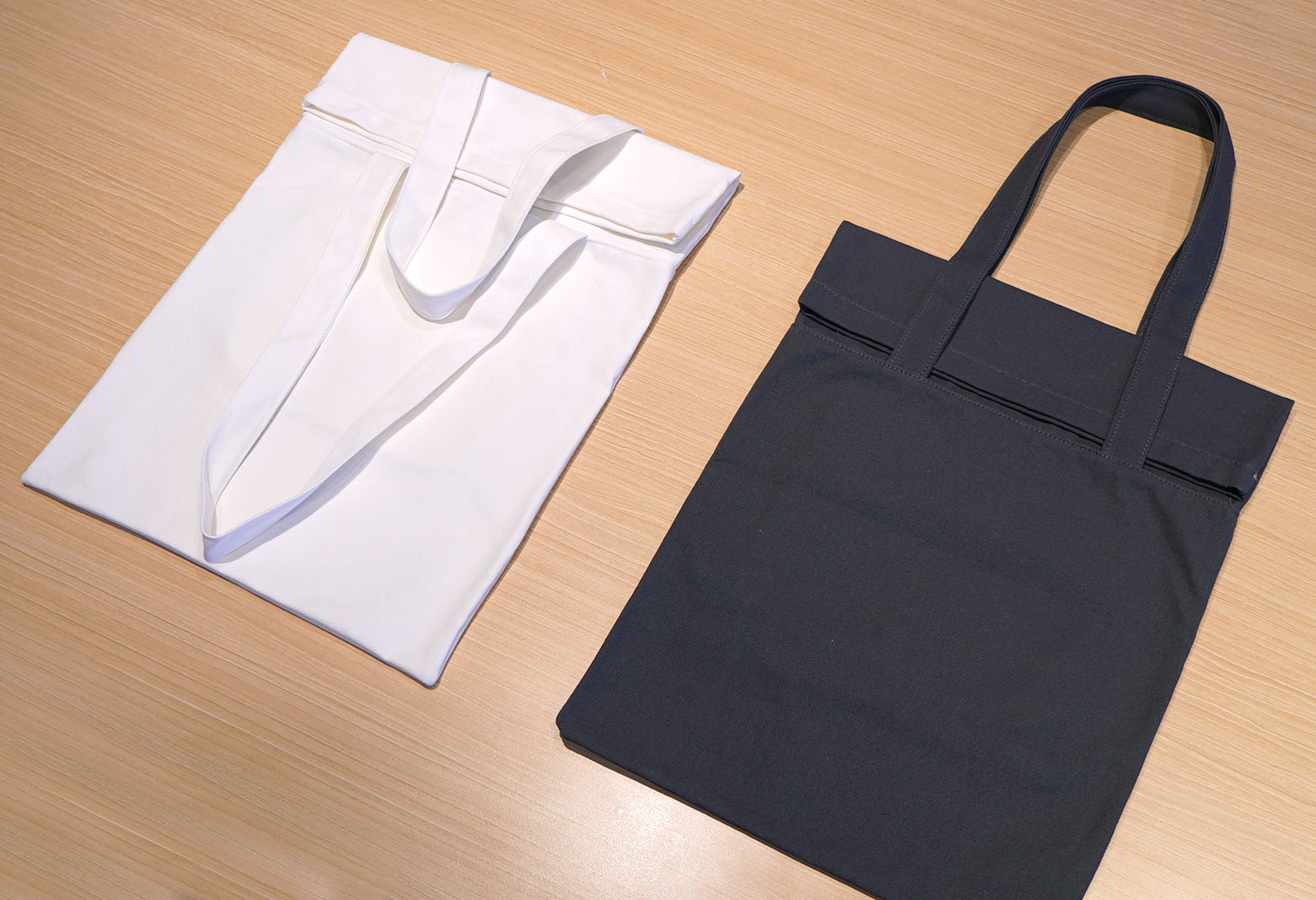 하지만 폴드 오버는 복원력이 좋은 가죽으로 만드는 가방에 적용하는 방식이어서 에코백 원단으로도 폴딩이 가능한지 프로토타입을 만들어 봐야 했다. 첫 번째 에코백처럼 얇고 워싱 처리가 된 원단보다는 두꺼운 원단으로 제작해야 안정적인 폴딩이 가능할 것이라 예상했고, 두꺼운 원단으로 만들게 되면 무거운 물건도 부담 없이 넣고 다닐 수 있게 되어 고려해야 할 것들을 해결할 수 있었다.