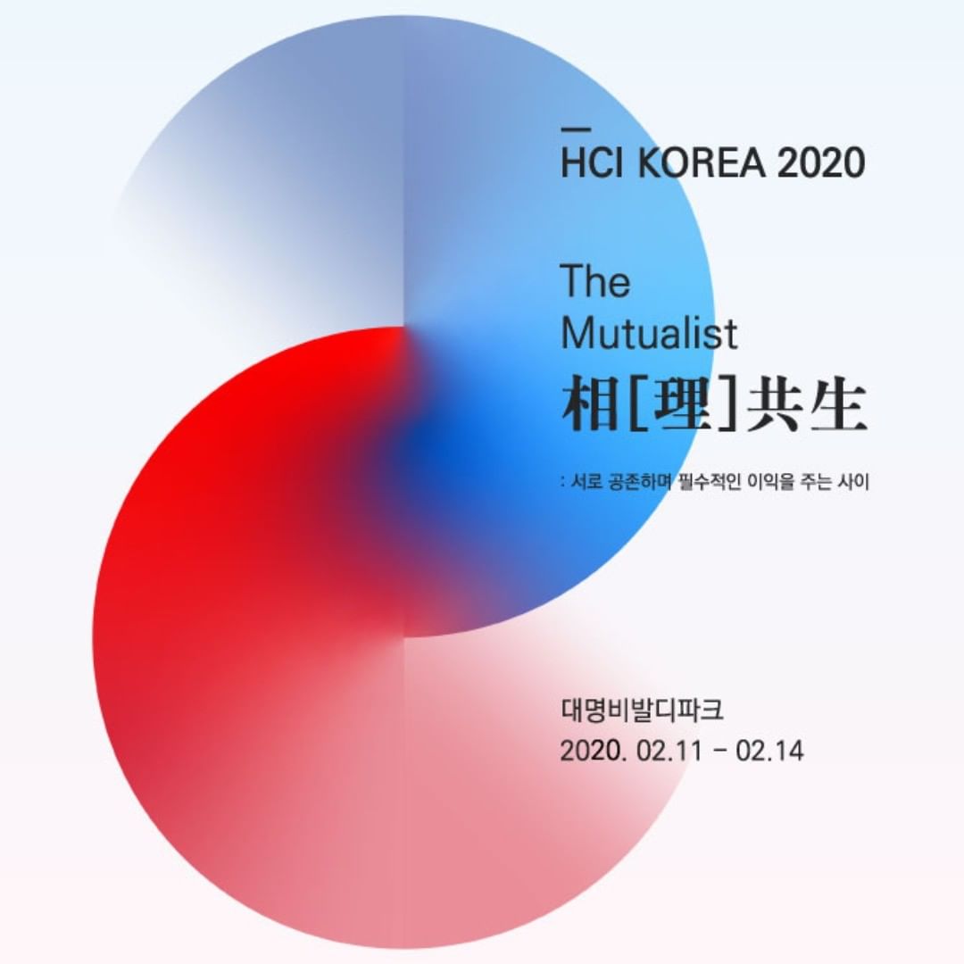 HCI Korea 2020 학술대회가 2월 11일(화)부터 2월 14일(목)까지 소노벨 비발디파크에서 개최됩니다. 올해는 서로 공존하며 필수적인 이익을 주는 사이라는 의미를 가진 'The Mutualist 相[理]共生'을 주제로 국내외의 전문가들이 인사이트와 생각을 나눌 예정이라고 합니다.
