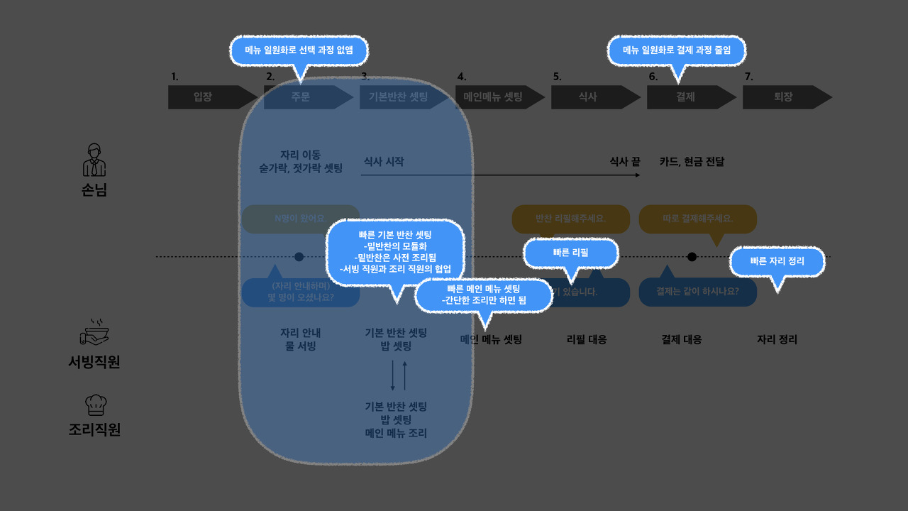 각 단계를 보면 알겠지만, 주문 그리고 기본 반찬 세팅부터 메인 메뉴 세팅 과정까지가 획기적으로 짧다. 어떤 때는 내가 자리에 앉는 속도보다 기본 반찬 세팅이 빠른 적도 있었다. 기본반찬이 나옴과 동시에 메인 메뉴 세팅이 된 적도 있었다. 이는 음식이 사전에 조리되어 담기만 하면 되도록 조리 프로세스가 갖춰졌기 때문이다. 또한 모든 단계가 물 흘러가듯 진행이 된다.