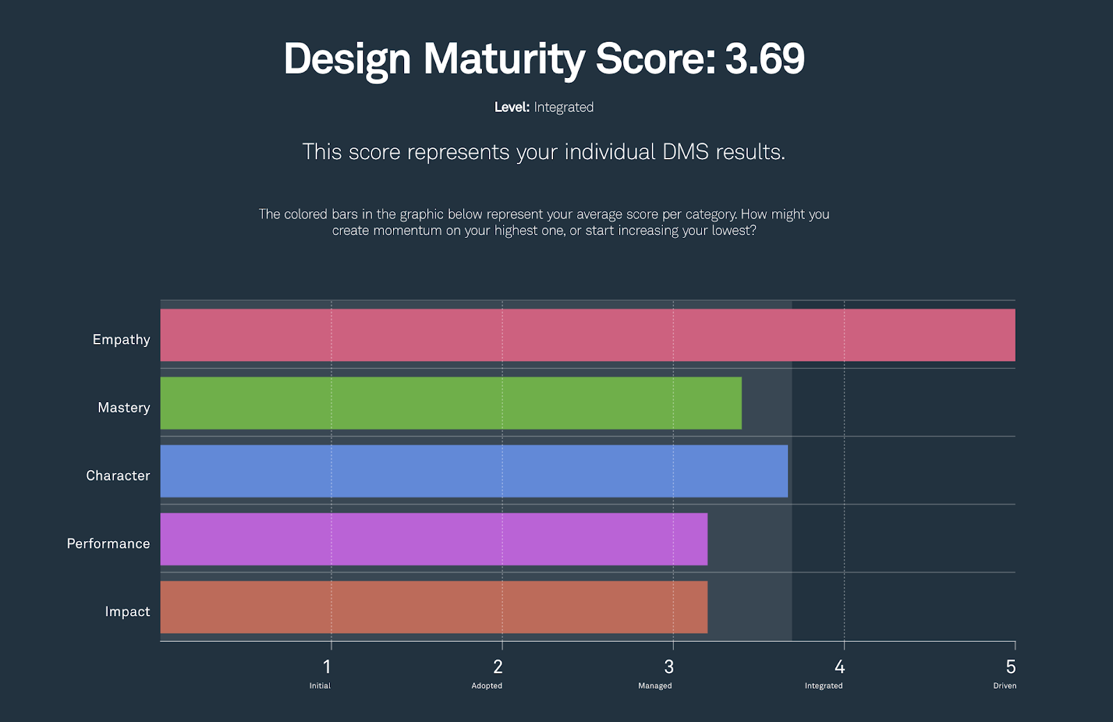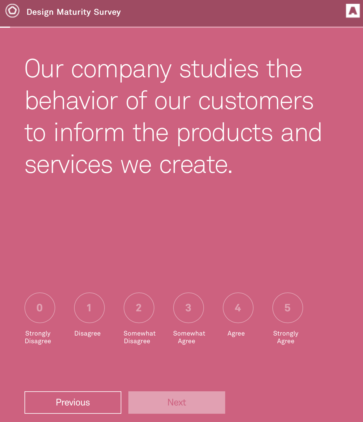 Design Maturity Survey는 다섯 영역의 주제를 기준으로 질문을 던집니다. 특히 디자인과 제품이 미치는 영향력을 통해 디자인의 질적 수준과 성숙도의 연관성을 이끌어 내고 있습니다.