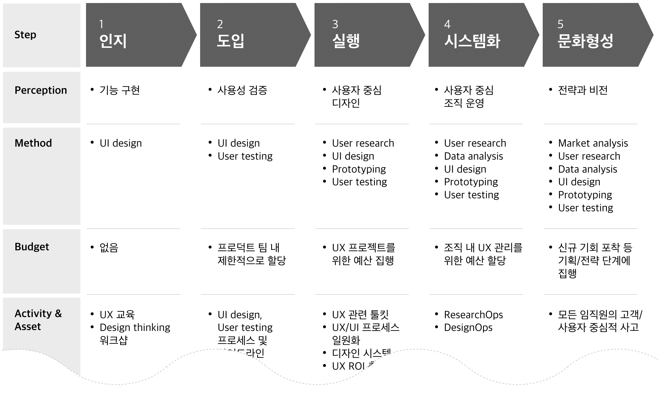 닐슨 노만 그룹에서는 UX 성숙도를 8단계로 설명하였습니다. 각 단계의 특징을 ‘UX에 대한 인식,’ ‘조직 구성,’ ‘예산 편성,’ ‘이 과정에서 해야 할 일,’ ‘다음 단계로 도약하기 위해 해야 할 일’로 구분하여 잘 설명하고 있습니다.