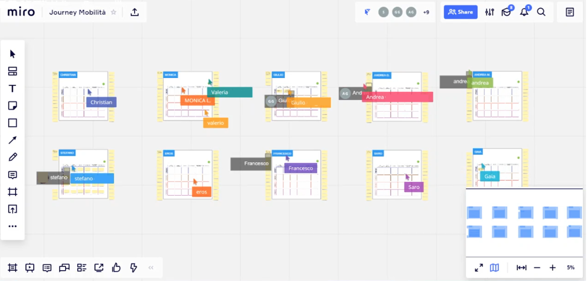 포커스 그룹 인터뷰도 운영하기 어렵습니다. 제한된 공간에서 낯선 사람들이 모이면 안 되기 때문입니다. 우리는 여러 툴을 사용해서 온라인으로 이야기를 나누거나 토론을 진행한 적이 있습니다. 이때, Wimsical, Miro, Mural과 같은 협업 툴을 사용하면 참가자가 직접 디지털 공간에서 작업하게 유도할 수도 있습니다. 2020년 3월 13일 금요일 밀라노에 있는 Assist Digital은 위와 같은 방법을 사용해서 사용자의 상호 작용을 포함한 최초의 원격 포커스 그룹을 성공적으로 수행했습니다.