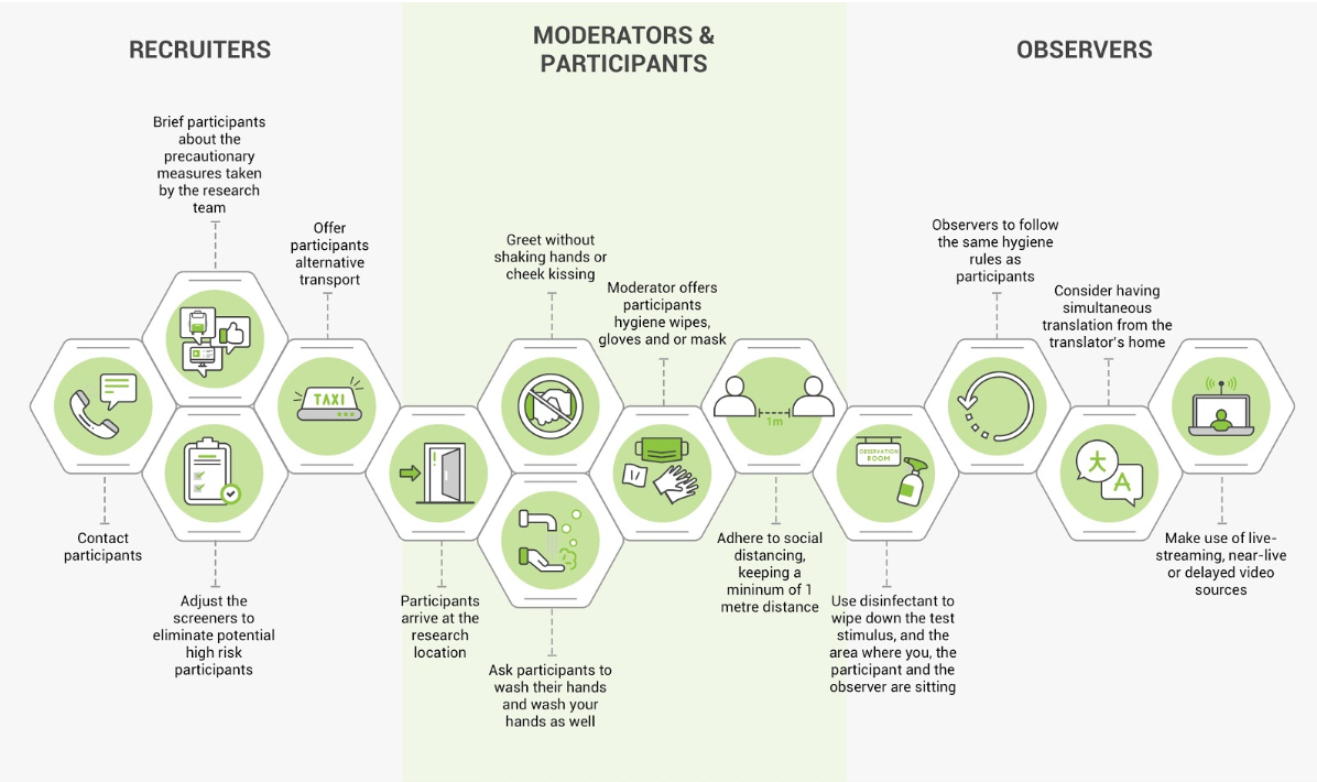 사용자 조사 시, 바이러스 및 고위험군과 접촉 가능성이 있는 참가자를 판별하기 위해 사전 스크리너를 활용할 수 있습니다. 또한, 급작스럽게 참여할 수 없거나 자가격리 상황이 발생하는 경우, 다른 사용자로 대체할 수 있도록 사용자 리크루팅 풀을 더 많이 확보해야 합니다.