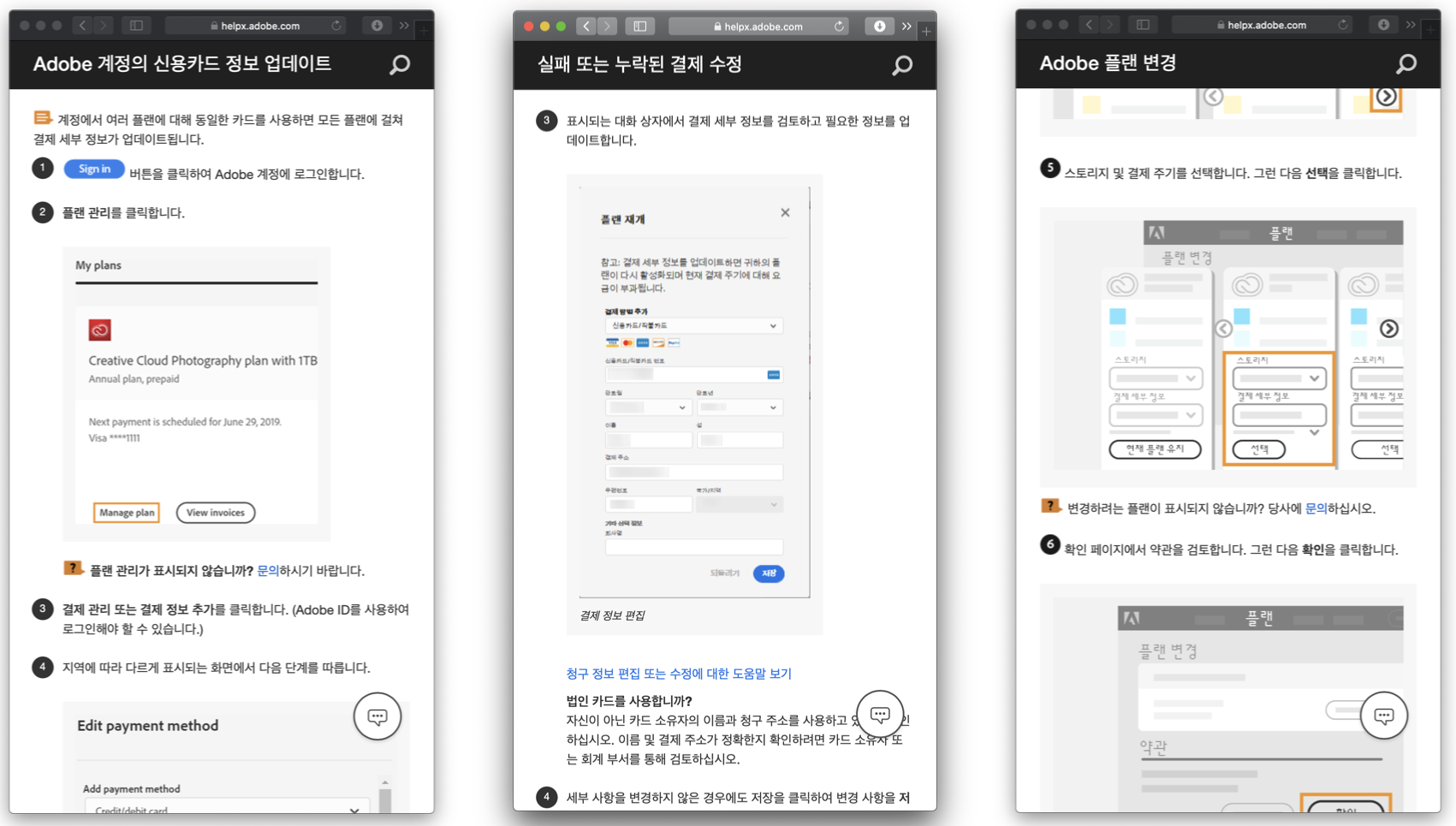 사용자들이 서비스를 이용하던 중 문제가 발생할 때, 이를 효율적으로 지원하기 위해 기업에서는 서비스내 가이드 문서나 FAQ를 제공합니다. 이 때 이미지나 동영상을 활용하는 경우가 많은데요. 특히 서비스/제품의 캡쳐 이미지가 사용되는 경우, 이미지 속 텍스트가 기존 언어로 남을 위험이 있습니다. 따라서 세계 여러 언어를 대상으로 유연하게 설계하기 위해서는 보통 이미지 안에는 텍스트를 쓰지 않는 걸 권장합니다.