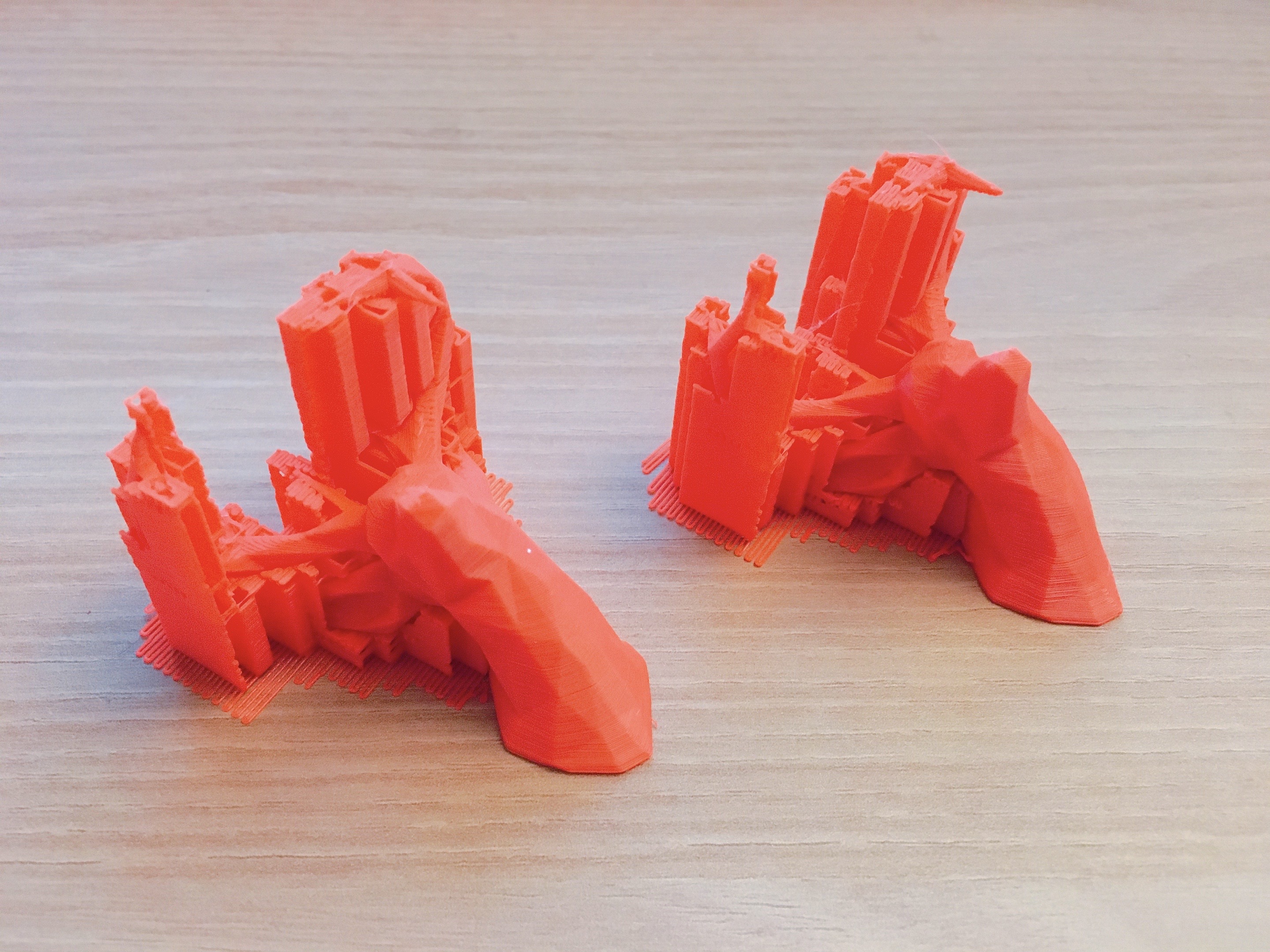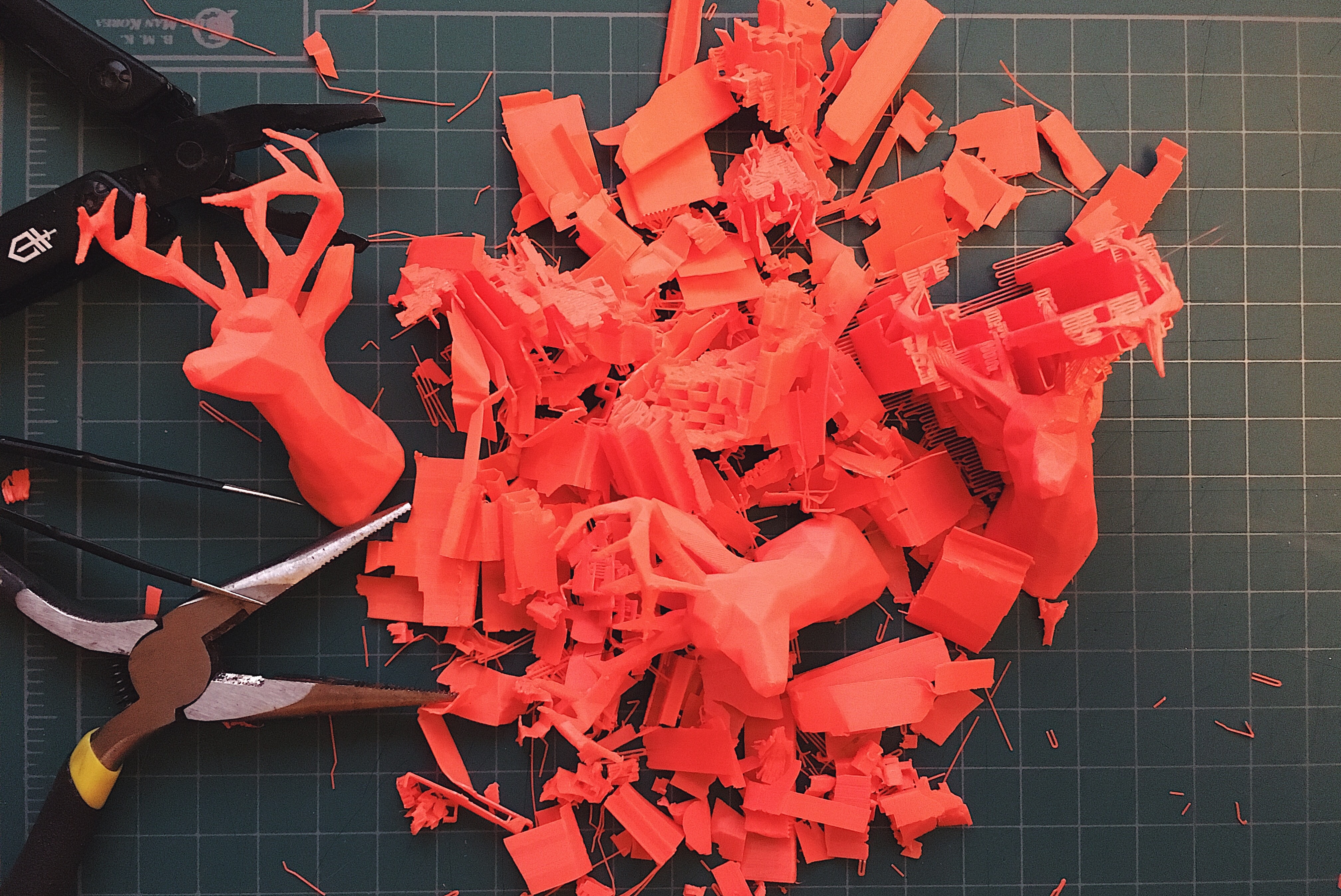 요 얼마 전에는, Low-poly로 만들어진 헌팅 트로피를 출력해봤습니다. 사슴인데, 사슴의 뿔이 얇고 복잡해서 제대로 뽑힐까 걱정을 했었는데, 생각보다 잘 뽑히더군요. 물론 아래의 텅 빈 공간을 메워줄 서포트가 있어야 했기 때문에, 그것을 뿔과 조심히 분리해내는(캐내는) 작업을 해야 합니다. 사실 힘들었어요...